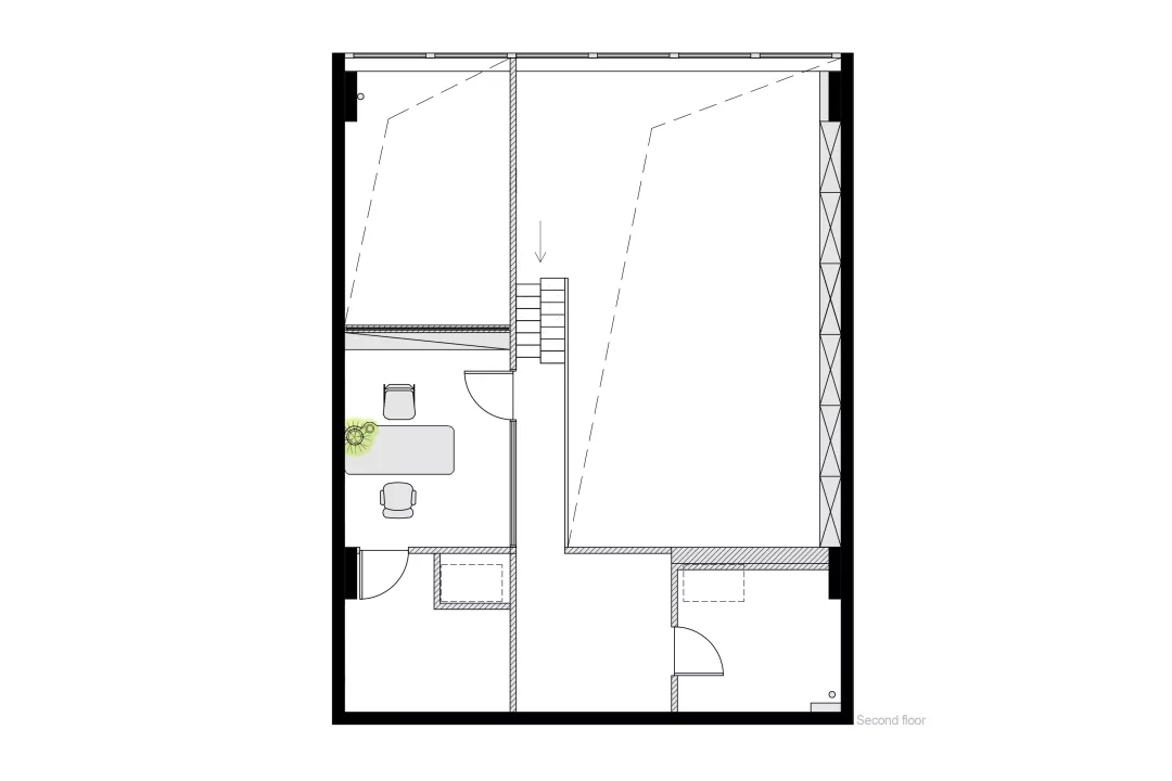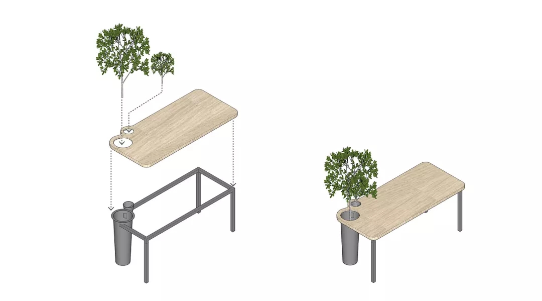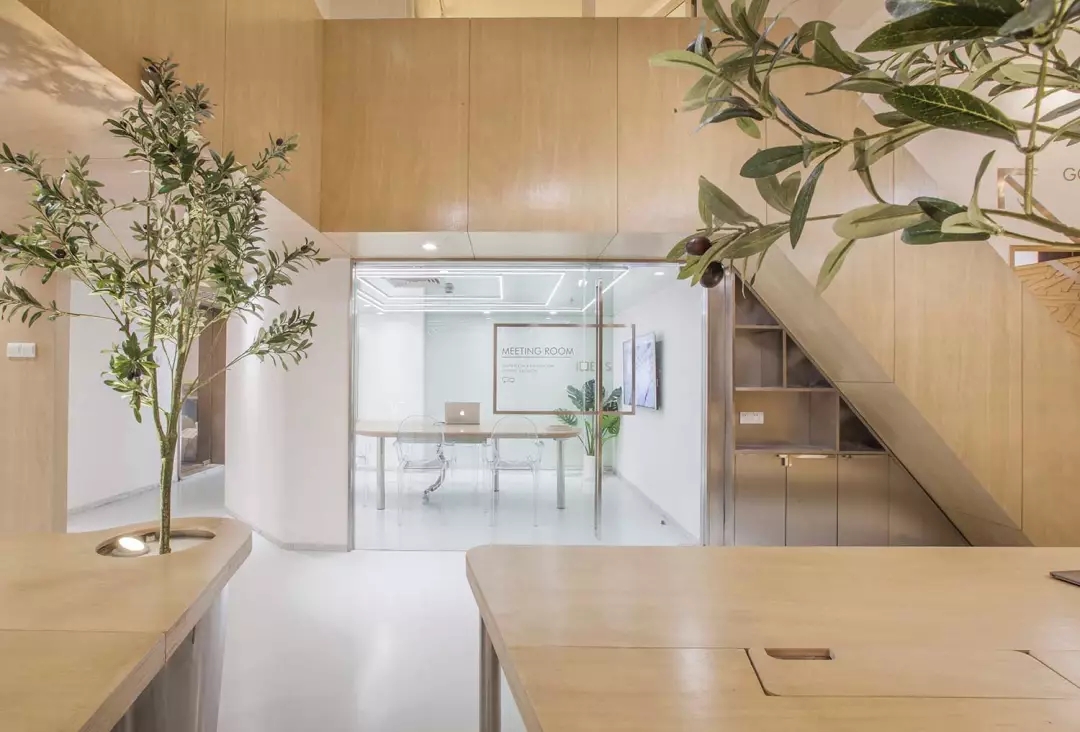 同時(shí)我們希望有一個(gè)張別具一格的會(huì)議桌,但是會(huì)議桌極強(qiáng)的功能性使得難以去進(jìn)行改變。于是,會(huì)議室空間本身的形狀缺陷成了這張桌子想法的起點(diǎn)。由于避讓入口玄關(guān),會(huì)議室空間有一個(gè)角是切掉的,墻壁是斜著放置,如果是長(zhǎng)方形的會(huì)議桌,就必然在這個(gè)斜墻前造成使用空間不夠缺陷,無(wú)法坐人.所以就產(chǎn)生了一個(gè)平行四邊形的會(huì)議桌,斜邊與空間的斜墻平行,也讓整個(gè)斜墻前的空間可以坐下一個(gè)參會(huì)者,再嵌入一些小草,一張獨(dú)特又實(shí)用的會(huì)議桌就出來(lái)了。