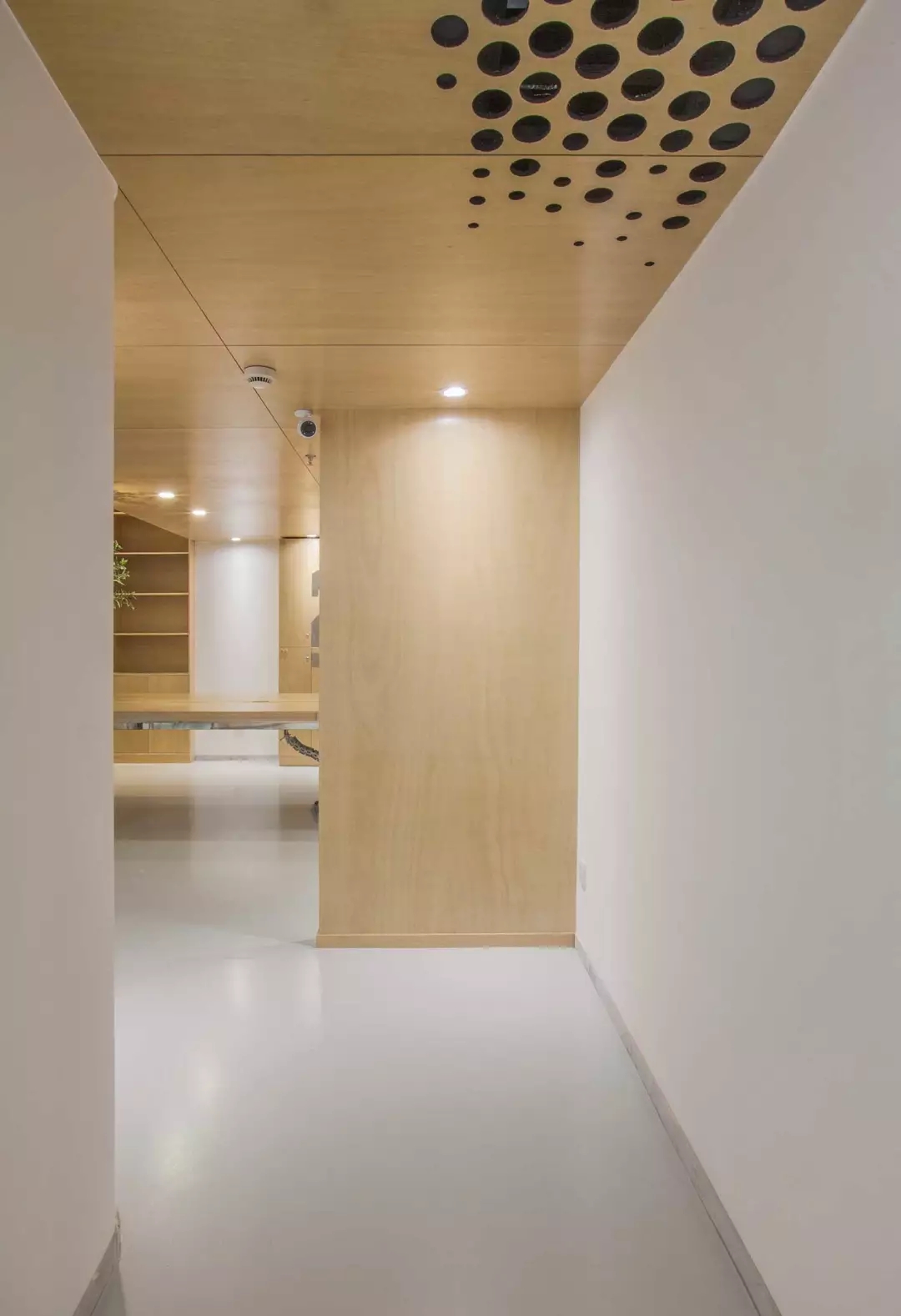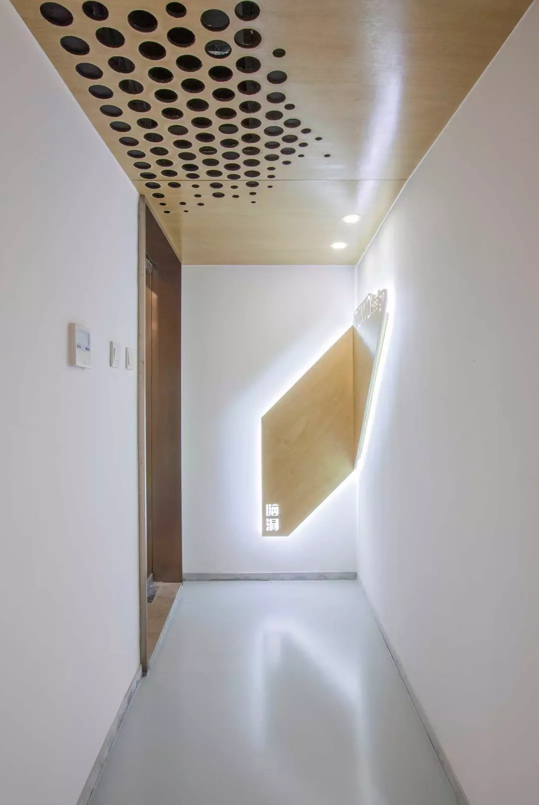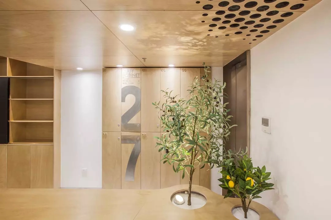 功能融于樂(lè)趣與創(chuàng)意,兩個(gè)空調(diào)的回風(fēng)孔也不能放過(guò),市面上的百葉口為了實(shí)用而完全無(wú)法融入環(huán)境。由于吊頂也屬于木質(zhì)體塊,所以經(jīng)過(guò)試驗(yàn),一個(gè)充滿漸變的點(diǎn)陣圖形,解決了這個(gè)問(wèn)題,不同規(guī)格的開(kāi)孔器進(jìn)過(guò)精心布置并開(kāi)洞,讓空間回歸純粹與樂(lè)趣。