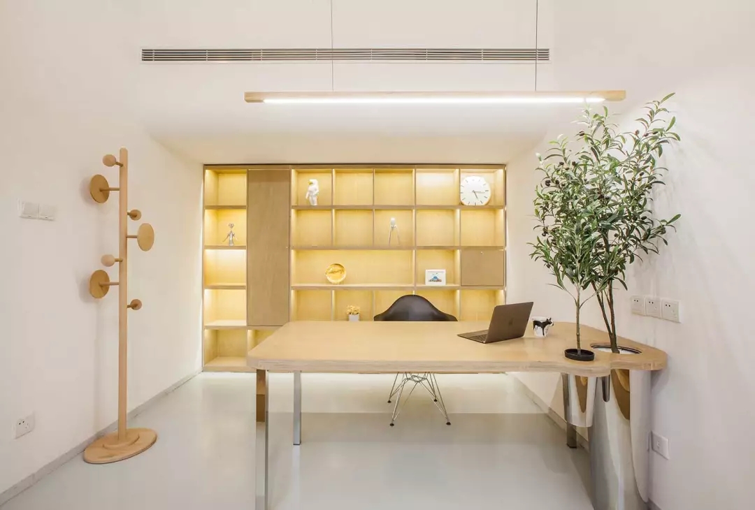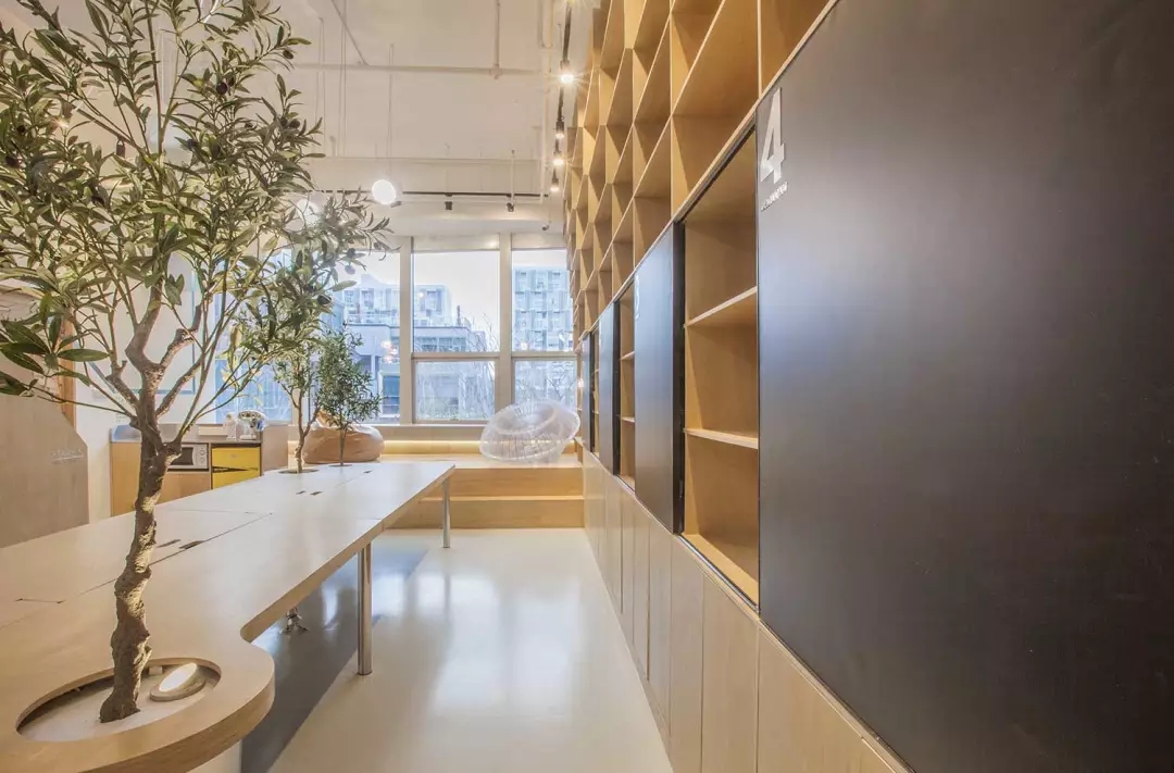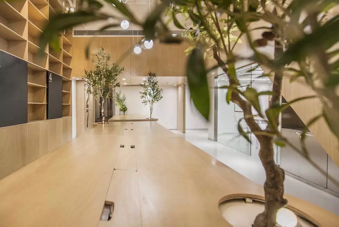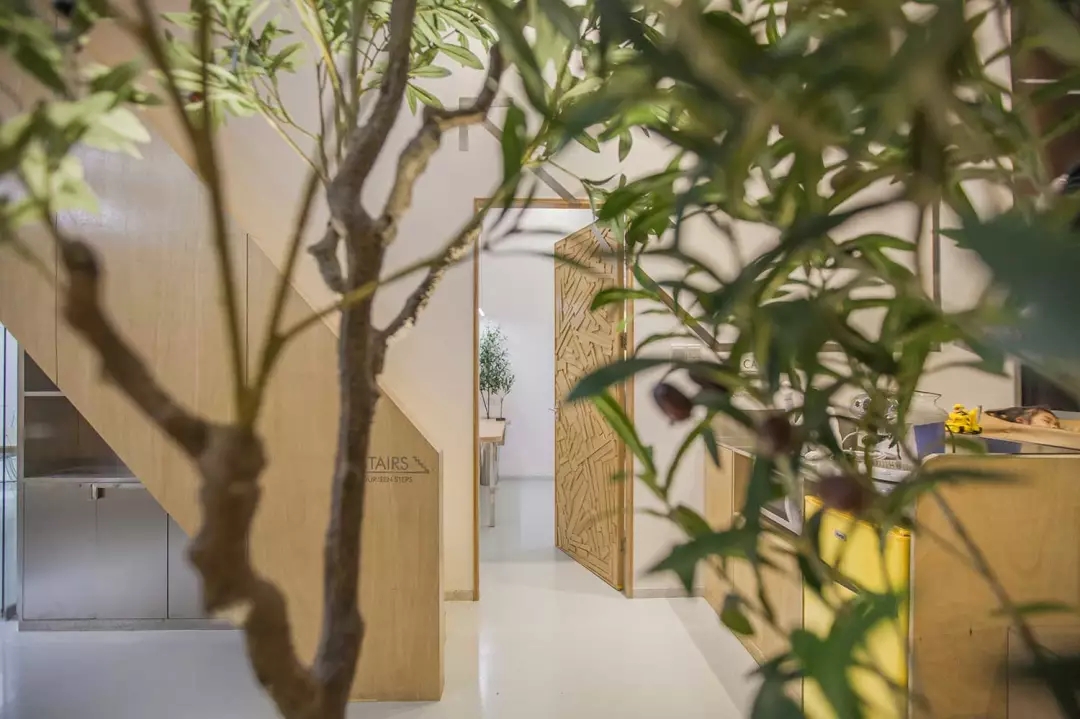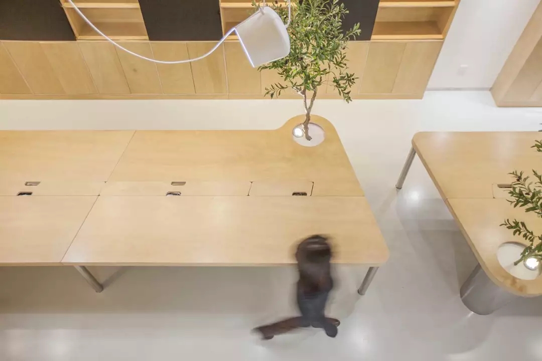 辦公桌與樹(shù)的結(jié)合,成為了整個(gè)空間的內(nèi)景觀,也與外面的綠色形成呼應(yīng),消減以往辦公的緊張氛圍。整墻的書架也不甘無(wú)趣,在實(shí)用的框架下,產(chǎn)生一絲波動(dòng)的起伏,如同山崖,如同坡面。