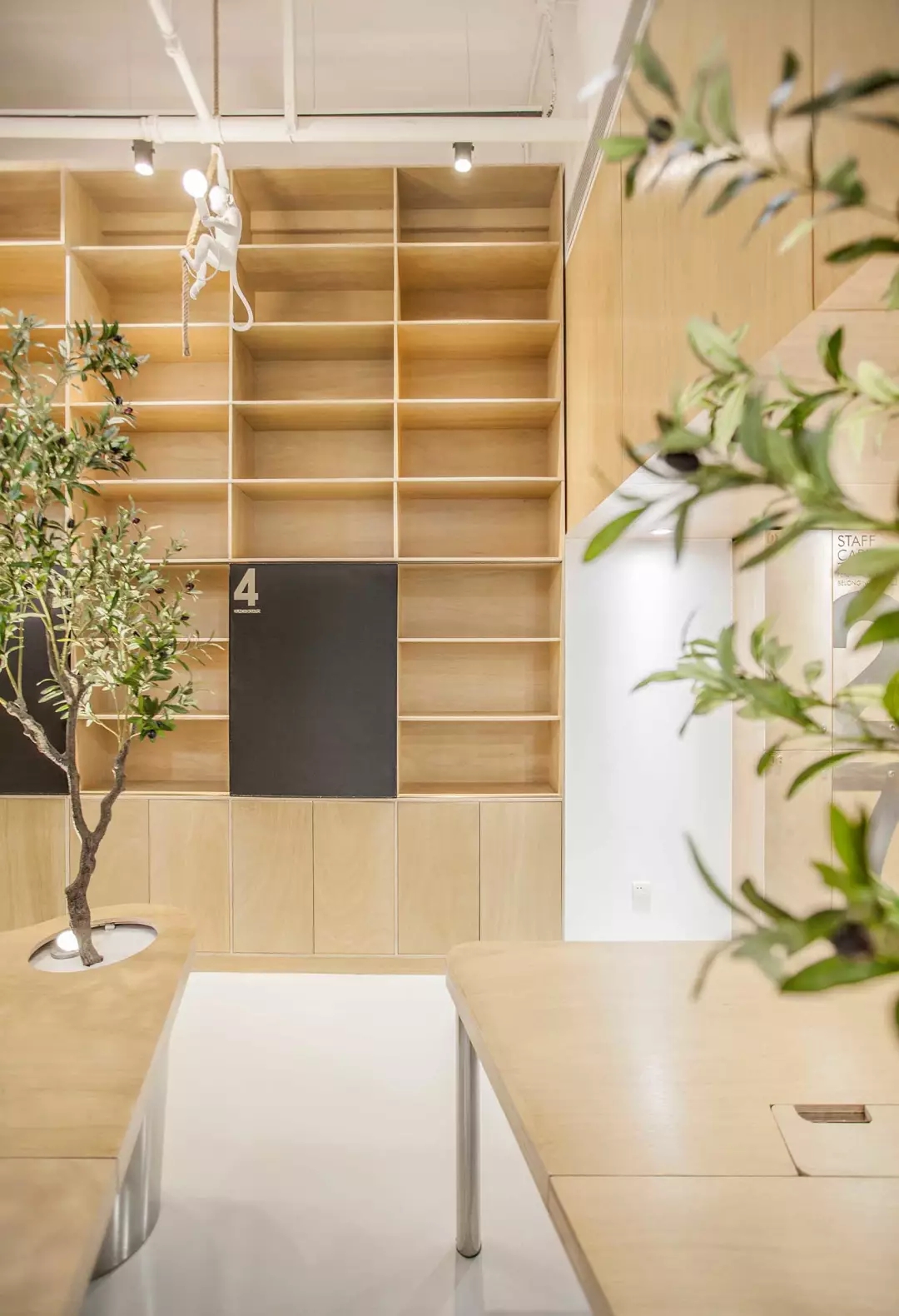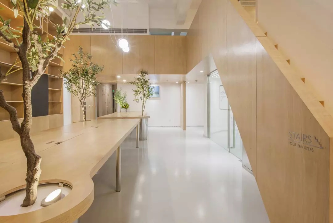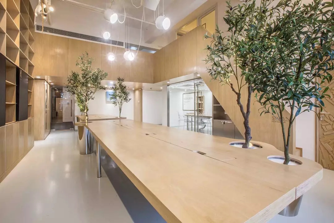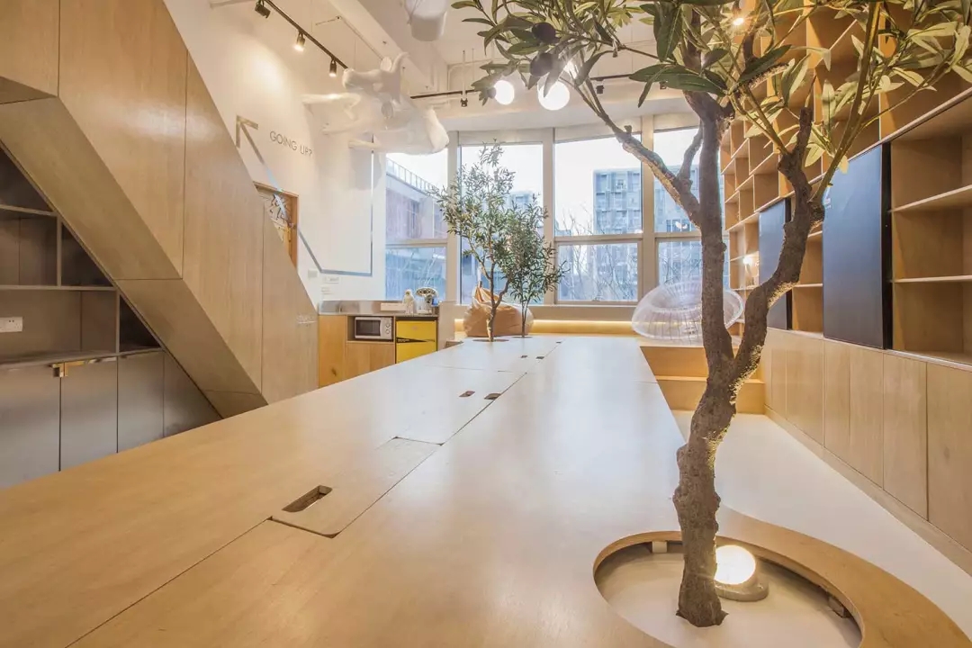 辦公桌與樹(shù)的結(jié)合,成為了整個(gè)空間的內(nèi)景觀,也與外面的綠色形成呼應(yīng),消減以往辦公的緊張氛圍。整墻的書架也不甘無(wú)趣,在實(shí)用的框架下,產(chǎn)生一絲波動(dòng)的起伏,如同山崖,如同坡面。