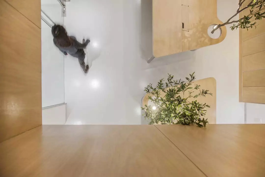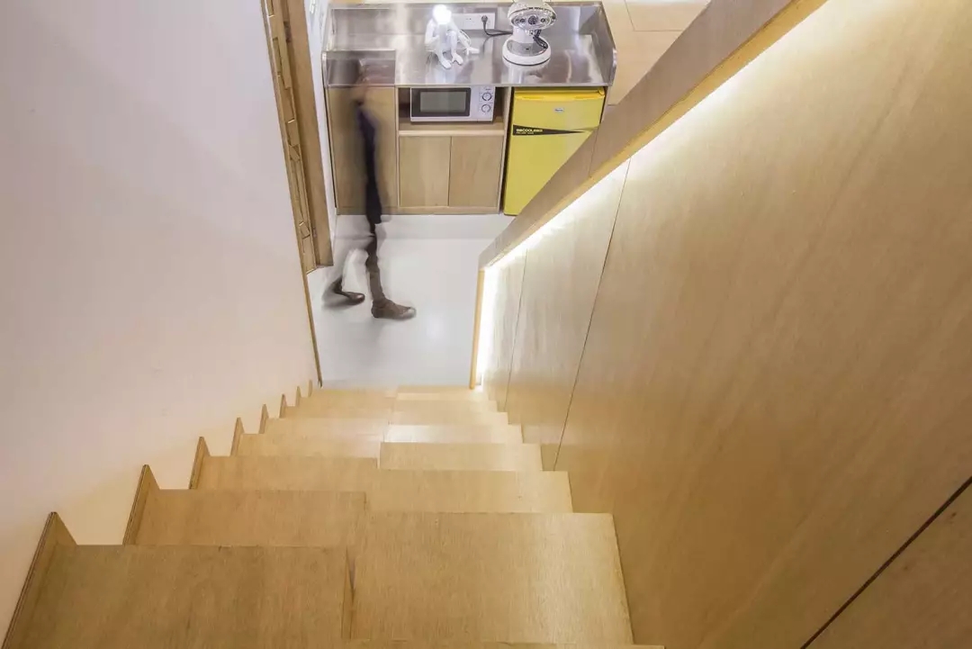 ▲交錯(cuò)的樓梯節(jié)省了樓梯的長(zhǎng)度,避開(kāi)了頭頂?shù)臋M梁,順帶凹個(gè)造型