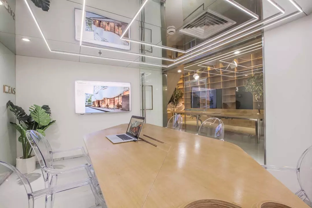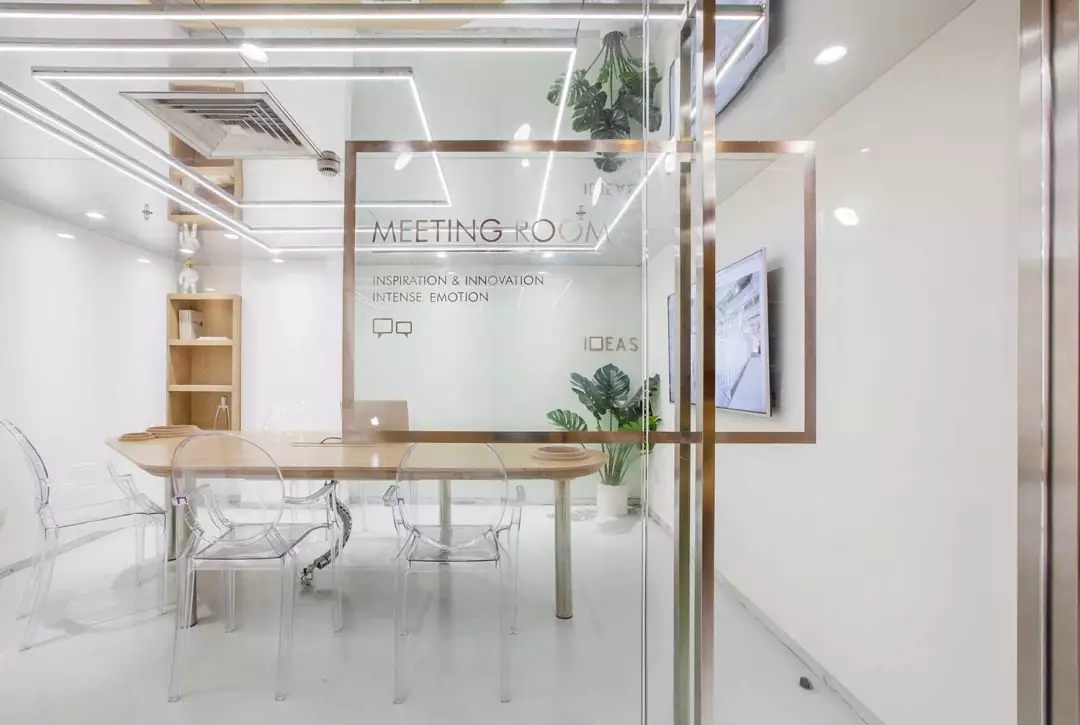 由于層高的限制,會(huì)議室感覺(jué)比較壓抑,所以將整個(gè)天花變?yōu)殓R面,化解的層高的局限,也讓空間感別具一格.但是空調(diào)的出風(fēng)散流器非常扎眼,空調(diào)的位置決定了風(fēng)口位置無(wú)法移動(dòng)。而市面上又找不來(lái)合適的可以符號(hào)化的替代品,于是,就順勢(shì)而為,將會(huì)議室的照明以散流器為中心進(jìn)行布置,讓散流器的方框與燈光呼應(yīng)起來(lái),形成了會(huì)議室有意思的圖形。
