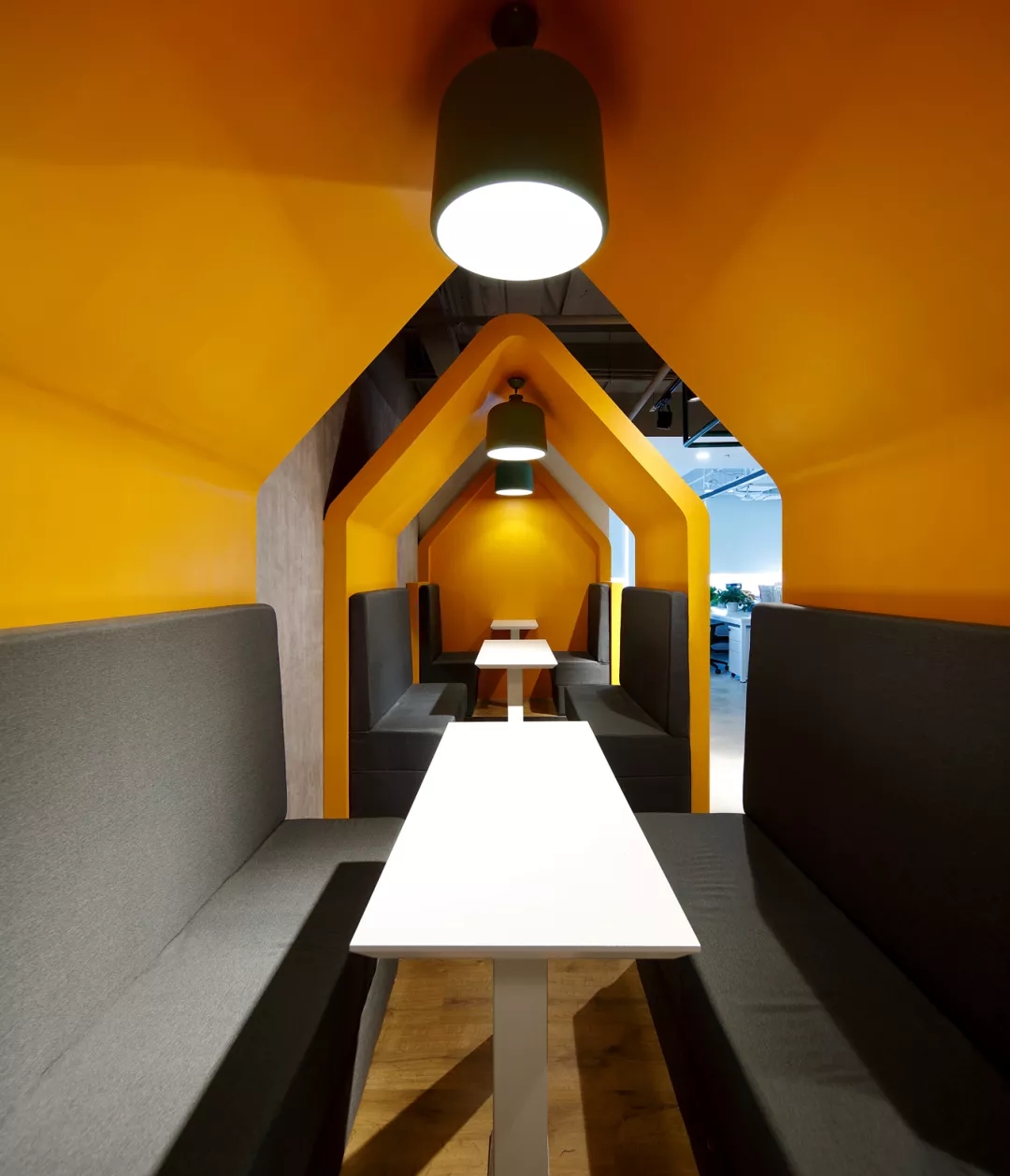 最新完成的整層辦公區(qū)延續(xù)了主體風格,少了花俏的點綴,更多地使用色彩碰撞來提振精神,比如亮橙色開放會議間與品牌VI的臟灰色搭配。也首次嘗試了全白色調(diào)的通透會議室,算是對極致風格的小探索。