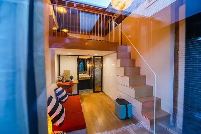 “共享際”是一座原理有點(diǎn)類(lèi)似青年公寓的共享租房空間,圖為位于前門(mén)的打磨場(chǎng)共享際,每間住房為上下兩層的LOFT空間