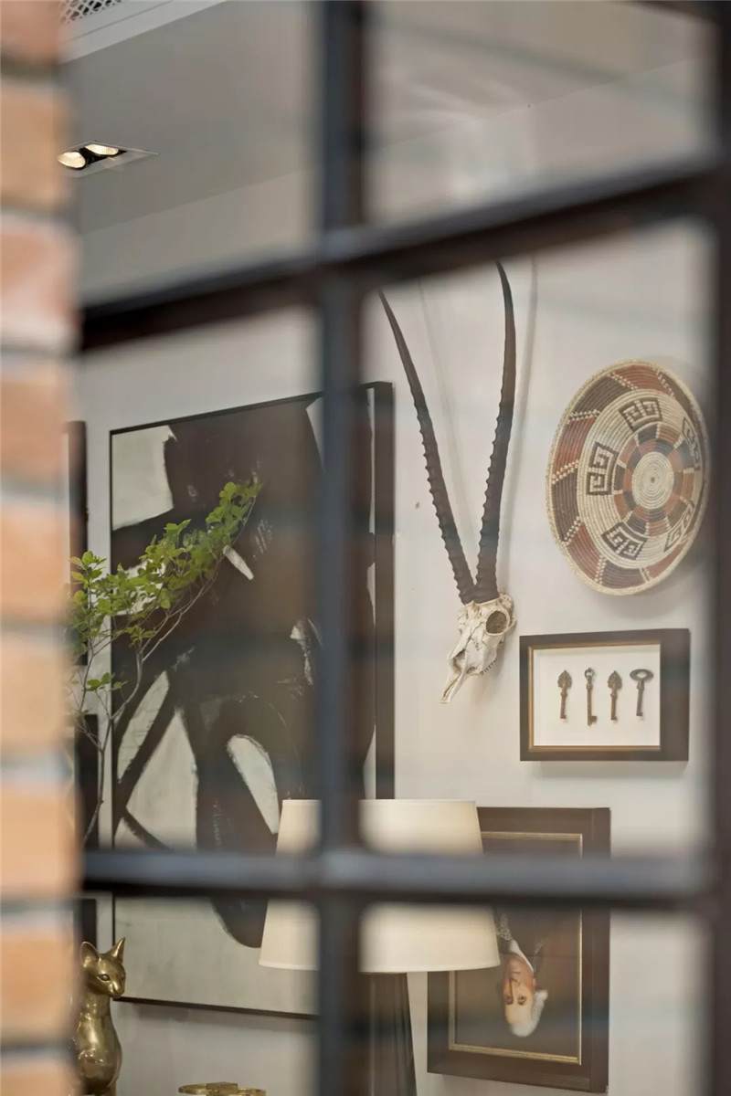 起居室背景展示墻,以混搭風(fēng)格鋪陳出洛普普的敘事展現(xiàn)。原始的羚羊頭飾,彷若征服野性蠻荒,象征勝利光輝。鑰匙是正在延續(xù)著的權(quán)勢(shì)標(biāo)志。設(shè)計(jì)師用跳色的編織盤(pán)與抽象藝術(shù)畫(huà)將微量的彩色疊加進(jìn)黑白灰的間隙中,呈現(xiàn)出別樣、細(xì)膩的風(fēng)情。而左下角的守護(hù)貓,一如埃及傳說(shuō)中神秘的幸運(yùn)守護(hù)者,正看顧著明亮通透的窗外,不斷朝曦夕映的美好時(shí)光。