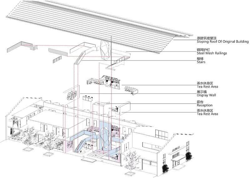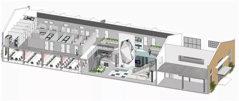 本案位于上海市寶山區(qū)蘊(yùn)川路6號智慧灣科創(chuàng)園,原建筑為3D打印的廠房裝修,室內(nèi)最高凈高9米,最低6.4米。此空間除原建筑結(jié)構(gòu)墻外,無任何結(jié)構(gòu)柱與墻體,因此為了更充分合理的利用空間,設(shè)計(jì)師構(gòu)筑了二層,根據(jù)嗶哩嗶哩電競的辦公功能訴求,布置空間功能區(qū),即1F分布前臺區(qū)、會議區(qū)、茶水接待區(qū)、賽訓(xùn)室、開敞辦公區(qū)、導(dǎo)播室。2F分布就餐區(qū)、住宿區(qū)、導(dǎo)播室等空間。