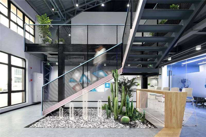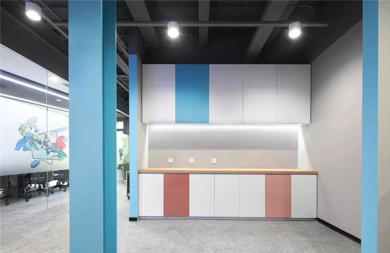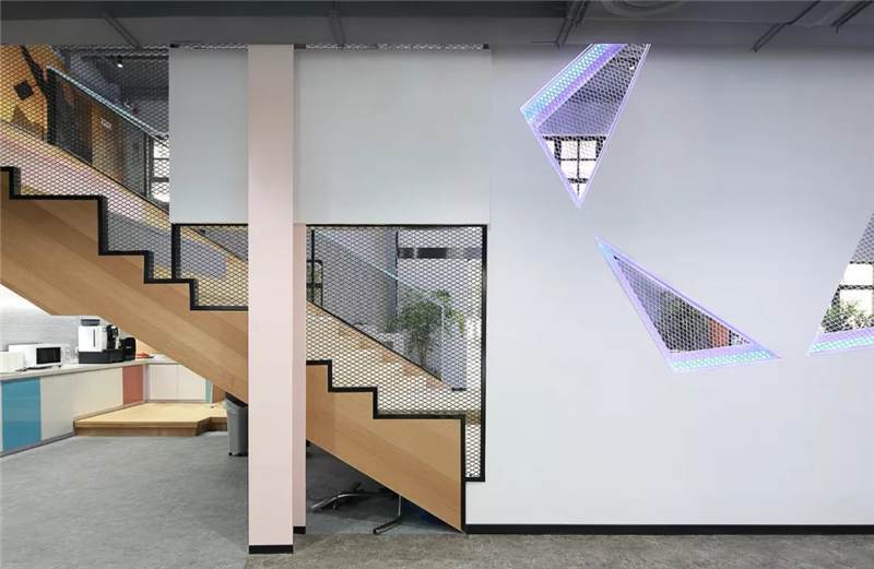 前廳區(qū)右側(cè),是直通二樓的木飾面步梯,臺階加寬,高度錯(cuò)落有致,LOGO藍(lán),粉,灰與原木色相間,這不僅僅是上下樓梯,更承載著員工的休憩與溝通交流功能,因此增強(qiáng)該區(qū)域的趣味性。步梯后方和右側(cè)吧臺巧妙的設(shè)計(jì)成一個(gè)連貫性的茶水區(qū),吧臺錯(cuò)落在茶水柜延伸出的區(qū)域,搭配綠植,增添生機(jī)和活力。