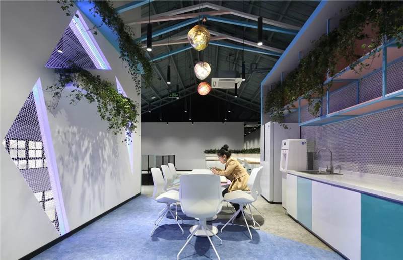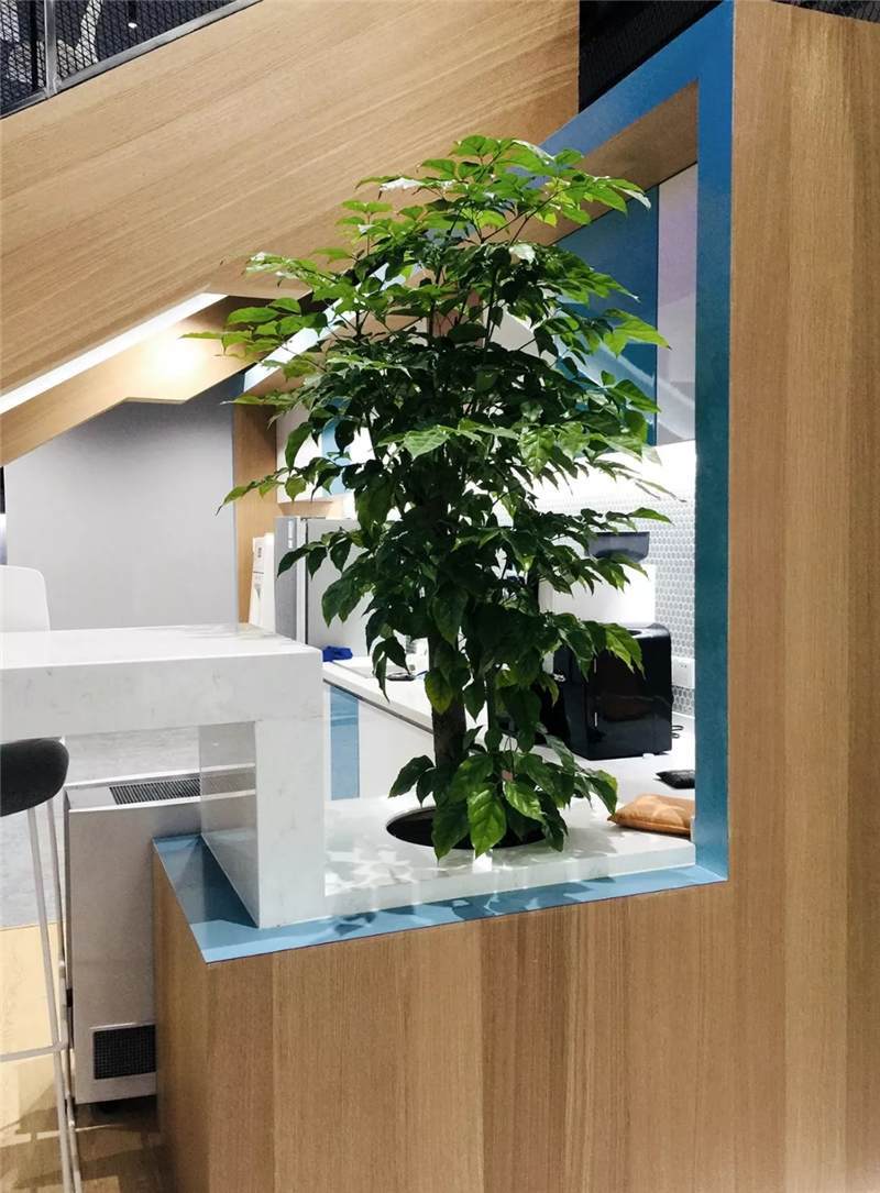 吊柜打破了傳統(tǒng)的平開門形式,使用開放的彩色盒子,實(shí)用兼裝飾功能。另外設(shè)計(jì)師還根據(jù)層高差,在茶水區(qū)頂部設(shè)計(jì)三角形格柵,茶水柜上方及背景墻后方,點(diǎn)綴綠植,使整個(gè)空間富有生態(tài)氣息,在光影的效果呈現(xiàn)別樣風(fēng)采。