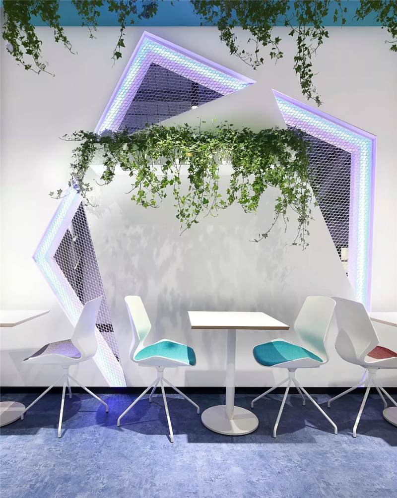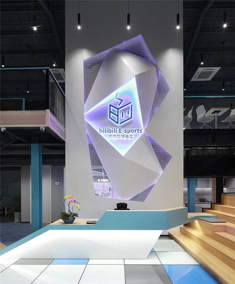 前臺接待區(qū)利用建筑結(jié)構(gòu)挑空空間的優(yōu)勢,塑造9米高的具有未來雕塑造型藝術(shù)感的LOGO背景墻,結(jié)構(gòu)形態(tài)上,設(shè)計(jì)師運(yùn)用B站文化中的創(chuàng)意與元素,中間由三維立體幾何造型與鐵絲網(wǎng)拼接而成,配以藍(lán)色燈光,彰顯公司文化的同時(shí)呈現(xiàn)電競的科技感,使得整體背景墻,體量和形態(tài)上給往來訪客和員工強(qiáng)烈的視覺沖擊感。
