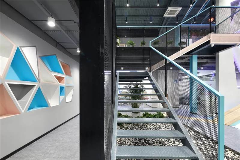 前廳左側(cè),設(shè)計(jì)結(jié)構(gòu)簡單的樓梯,運(yùn)用與二層欄桿材質(zhì)相同的鐵絲網(wǎng)扶手,使得兩層樓形成一個(gè)工業(yè)風(fēng)的整體。側(cè)邊與扶手點(diǎn)綴以藍(lán)色和粉色的噴漆,樓梯下布置用鵝卵石,仙人掌和燈光組成的景觀裝置小品,讓整個(gè)電競空間生機(jī)勃勃,平添許多年輕活躍的氛圍。此處木飾面的吧臺延伸到地面再與前臺、右側(cè)大臺階連接形成一個(gè)整體,使整個(gè)空間更加連貫統(tǒng)一。