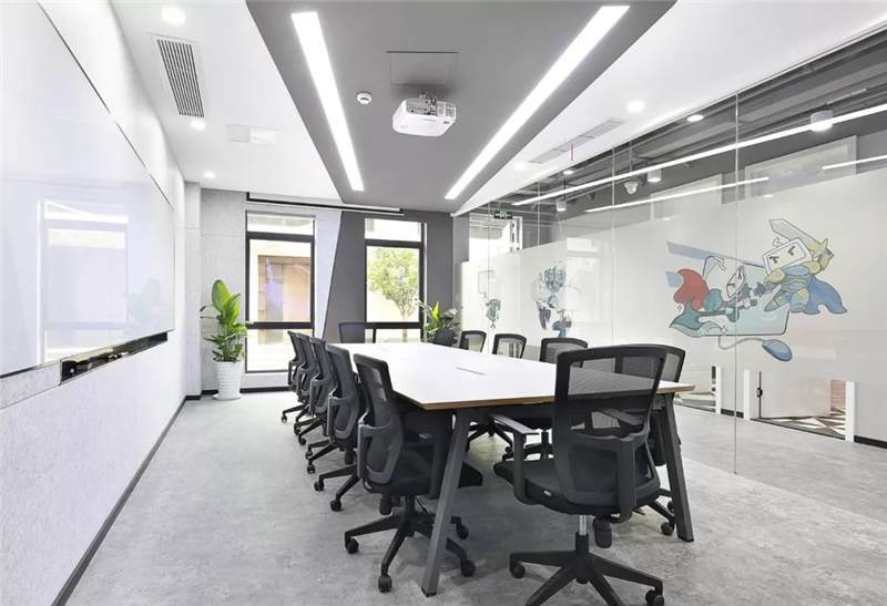 開放辦公區(qū)主體用大量的白色,更加干凈、簡潔;頂面燈具使用粉色,與其他區(qū)域相呼應(yīng);地面采用兩種地膠拼接,也使得空間更加有層次感。大小不同的會議空間設(shè)計(jì),運(yùn)用了天花到墻面再到地面的連貫造型,增加整個(gè)會議空間的靈活性。