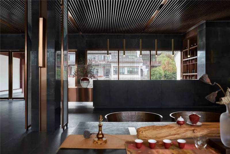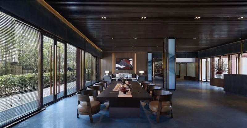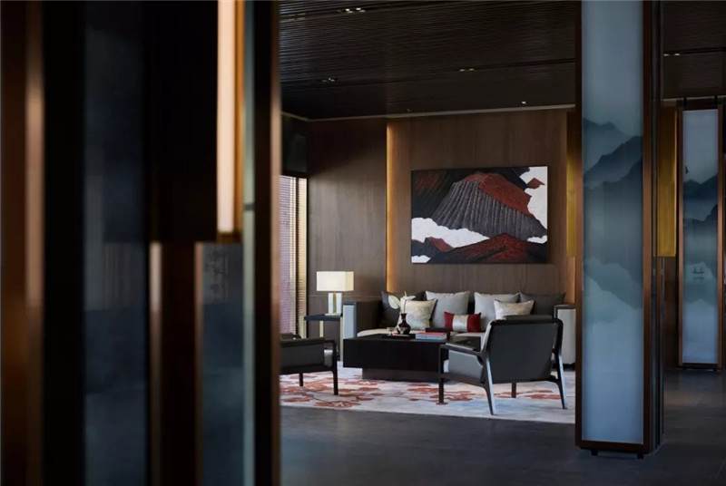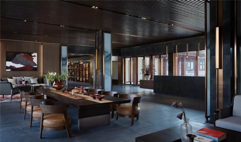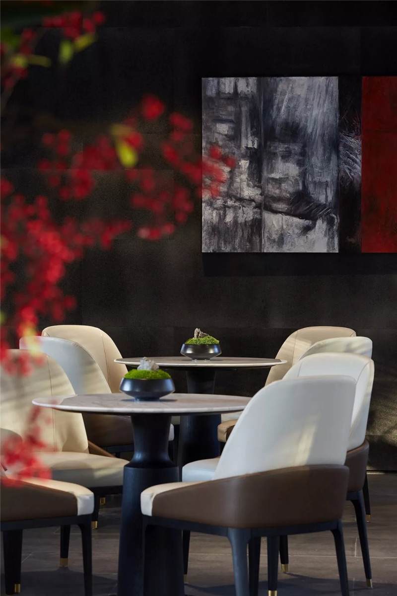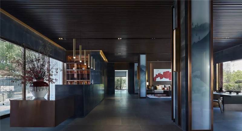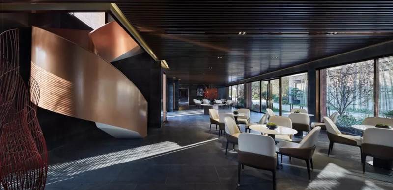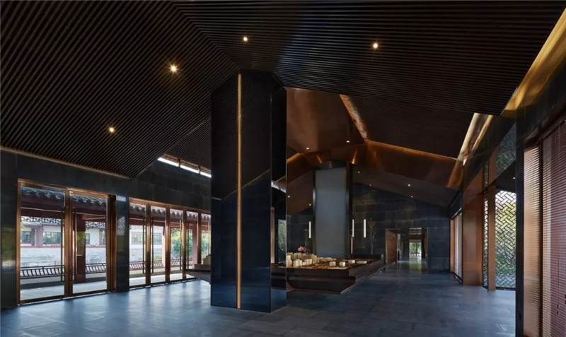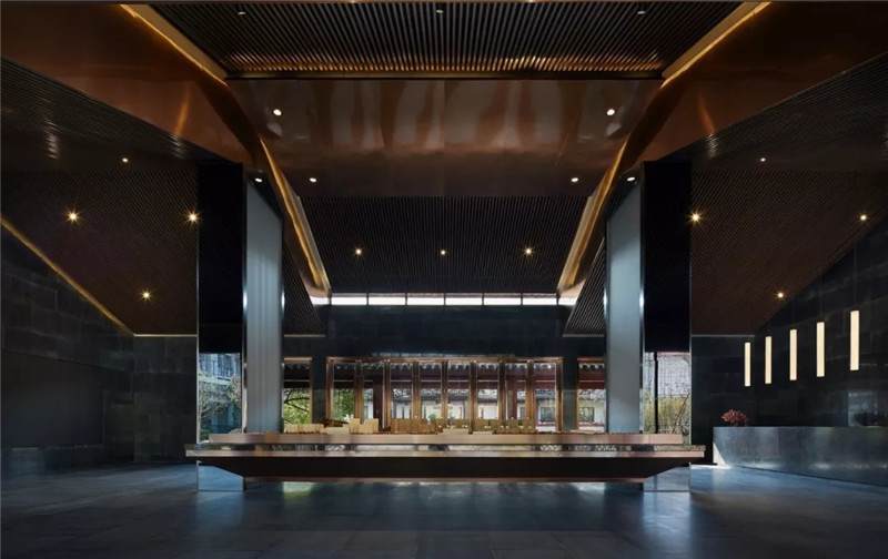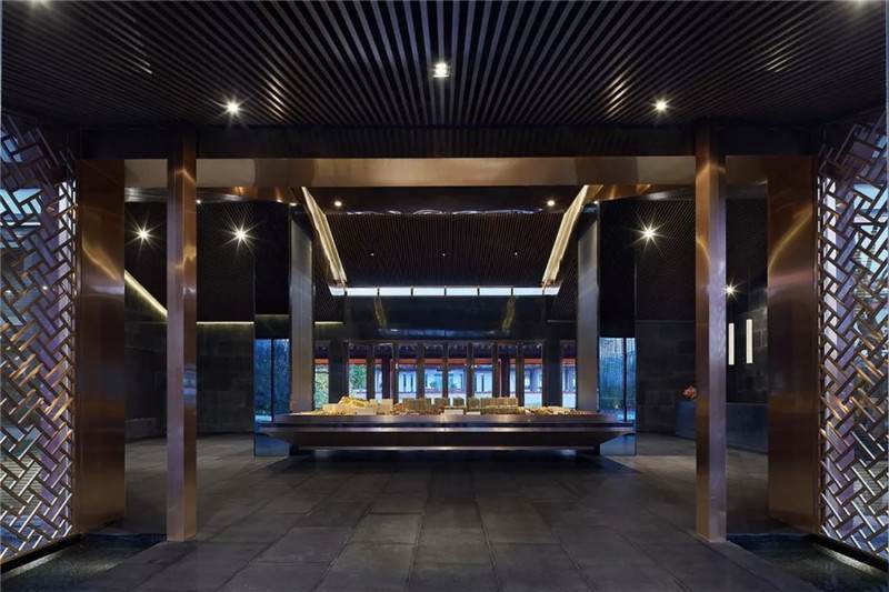 大堂內(nèi)注重材質(zhì)的克制與平衡,大面的黑色基底將儀式感與雄渾氣勢渲染而出。金屬鏤空格柵顯江南韻律,斜屋頂及頂端挑空區(qū)窗口,則是對傳統(tǒng)物態(tài)的解構(gòu)與再造。剝開視覺表象,映射出來的是現(xiàn)代、東方、藝術(shù)、自然等內(nèi)核元素,給賓客無與倫比的感官體驗。