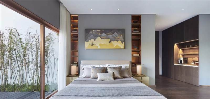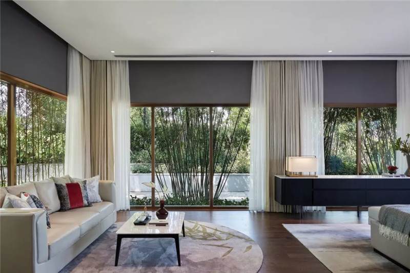 客房套間以現(xiàn)代簡約風范融入自然,呈現(xiàn)安寧愜意之境。設(shè)計師賦予其三面環(huán)景的奢享體驗,實現(xiàn)室內(nèi)與自然的對話,物器與光影的互動。