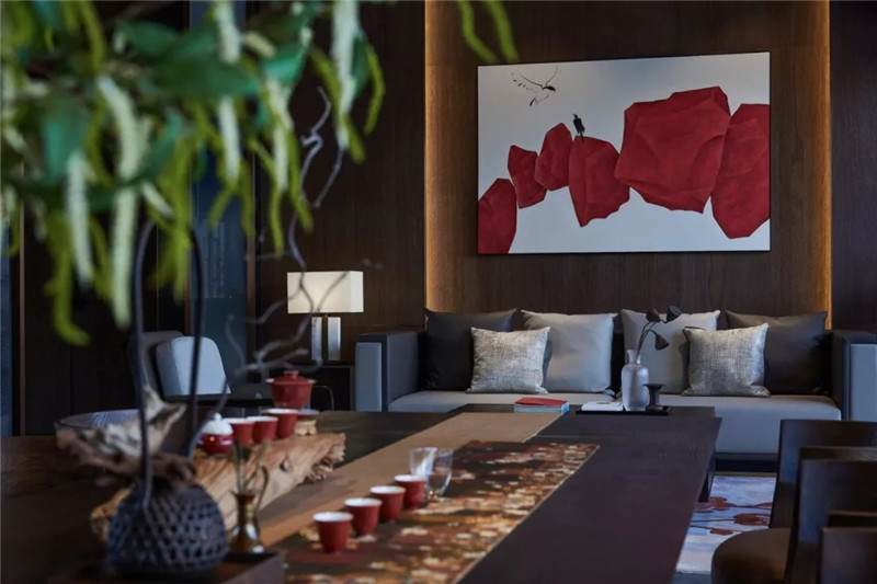 桌面借由點點紅綠添色,打破單調(diào),越發(fā)渲染生機與活力。兩端放置著極富水墨暈染狀的抽象畫作,以厚重的文化底蘊來響應(yīng)當下的時空與場域。