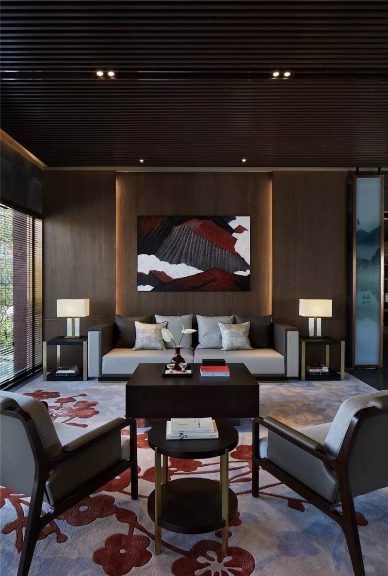 會客區(qū)處于中心茶臺兩端,對稱的手法、圍合的陳列、適宜的比例,實現(xiàn)多樣元素的碰撞演繹,剛?cè)岵?,飽含層次感。主背景木飾面嵌古銅,加上燈帶設(shè)置,顯得安靜而溫潤。