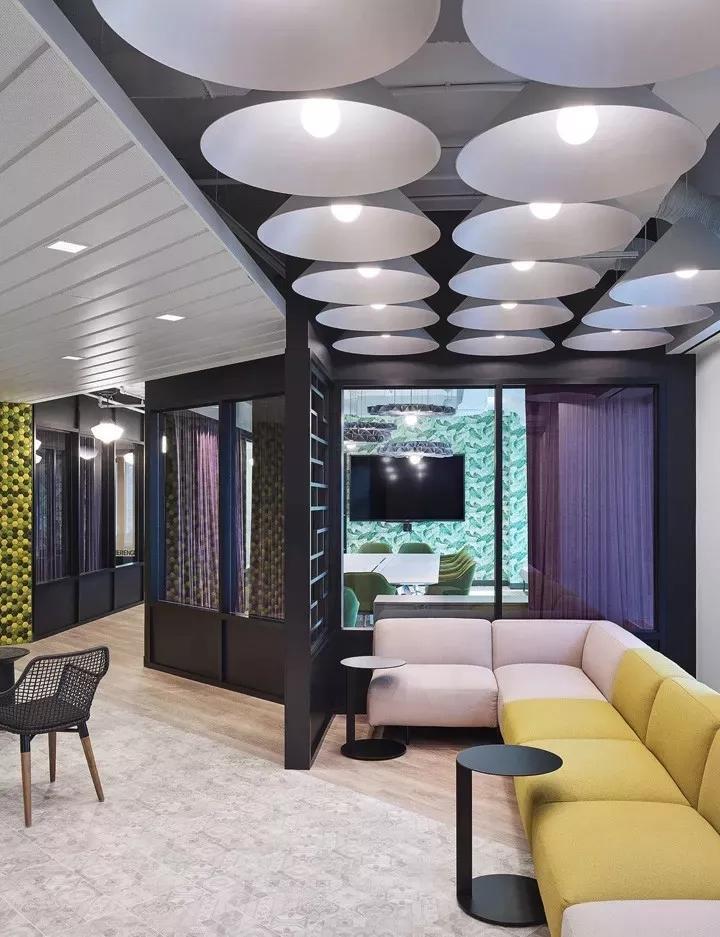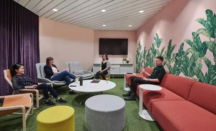 一間正式會(huì)議室,墻面鋪滿了綠色棕櫚葉墻紙,并配以綠色扶手軟椅,在綠色清新風(fēng)中,具有吸音性能的紫色布藝窗簾形成鮮明的色彩對(duì)比。毛氈聲學(xué)燈具BuzziPleat更是為整個(gè)空間錦上添花,帶來(lái)美美的視覺。