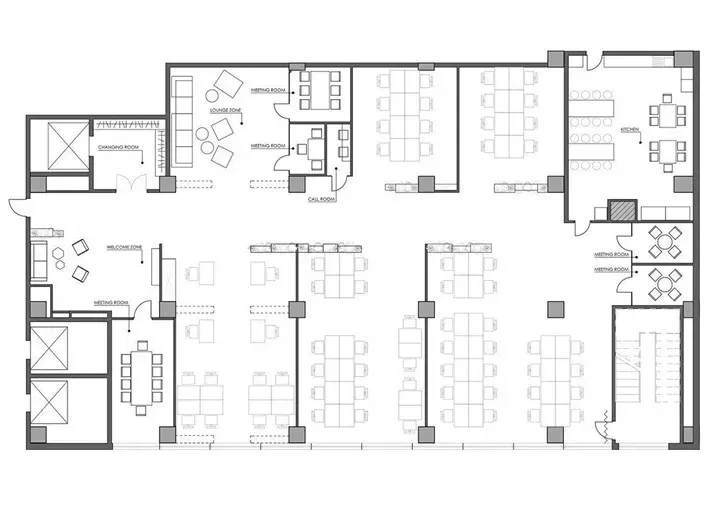 縱向型的空間構(gòu)成,每一個(gè)工作空間猶如一粒粒珠子被串聯(lián)在中軸線(xiàn)上,這些開(kāi)放工作區(qū)沿窗而設(shè),最大化引入自然光線(xiàn),同時(shí)各區(qū)域又可以任意變化。在功能規(guī)劃上設(shè)計(jì)了迎賓區(qū)、休息區(qū)、各種大小的會(huì)議室和自助餐廳。