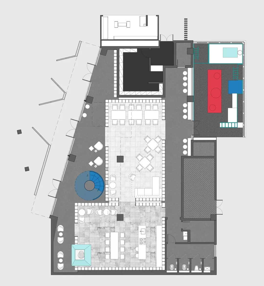 現(xiàn)場是個不規(guī)則的平面,如果排除未來可復(fù)制性,就著形狀設(shè)計(jì)并無不可,但這就缺乏了示范性意義。設(shè)計(jì)師按照客廳研究成果,在這個不規(guī)則平面最大極限設(shè)置了三個盒子,一個是功能性的,一個是社交性的,一個是女性的。如果把不規(guī)則的場地看成是一座城,這三個盒子就是內(nèi)城,而他們之間不規(guī)則的剩余空間可以自由定義的場所。