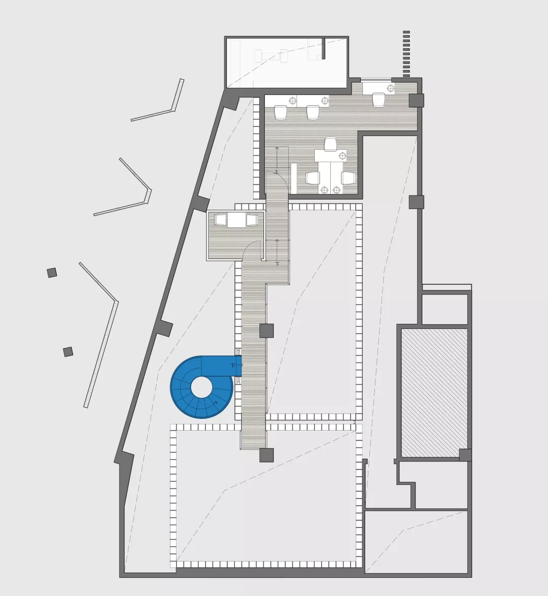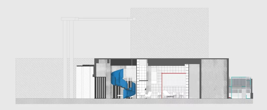我們設(shè)計(jì)了一個夾層走廊隱藏在書架上.在課題研究中如何利用層高一直是房產(chǎn)商關(guān)心的,以我的實(shí)際經(jīng)驗(yàn),凈高2.1米仍然具有一定舒適度。在本案中,原本懸在社交盒子上的麻將房因?yàn)橐粯菍痈哌^低無法成立,于是我們直接切斷,形成一個小陽臺作為暗示。