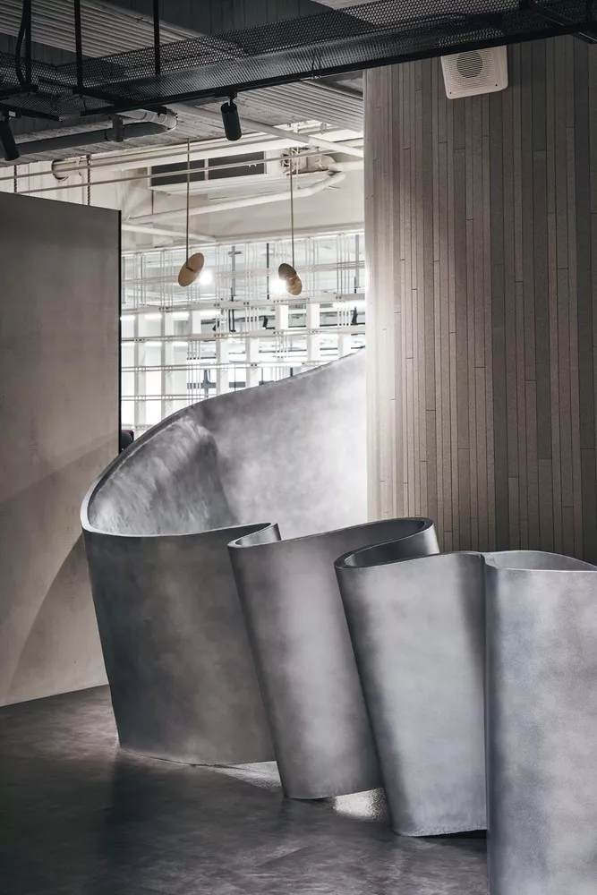 創(chuàng)意是無(wú)限,沒(méi)有邊界的。是一條線、亦是線聚集轉(zhuǎn)化而成的曲面。直線,是思考的軌跡。曲面,是每個(gè)創(chuàng)作的轉(zhuǎn)折,線條的動(dòng)靜之間,串聯(lián)了空間,刻意保留基地原貌的原質(zhì)肌理,植入了新的設(shè)計(jì)元素,呈現(xiàn)粗曠和細(xì)致的沖突美,來(lái)表達(dá)品牌精神:前衛(wèi)、年輕、精致、優(yōu)雅。充滿雕塑感的柜臺(tái),佇立于公共空間中充滿風(fēng)采,勾勒新穎且醒目的企業(yè)形象。