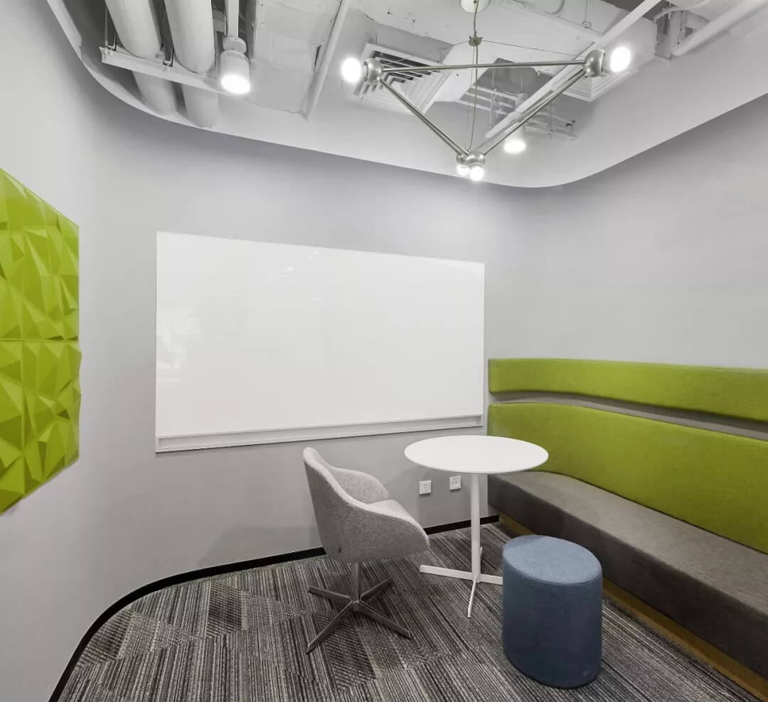 在軟裝設計上,該區(qū)域家具軟裝及墻壁,選擇明快的色調(diào),展示青春活力,并且用黑色烤漆玻璃內(nèi)嵌燈帶的方式營造氛圍,透著數(shù)字化和科技感,表現(xiàn)商湯在數(shù)字時代的不同場景中,所呈現(xiàn)的多元化和創(chuàng)新性。