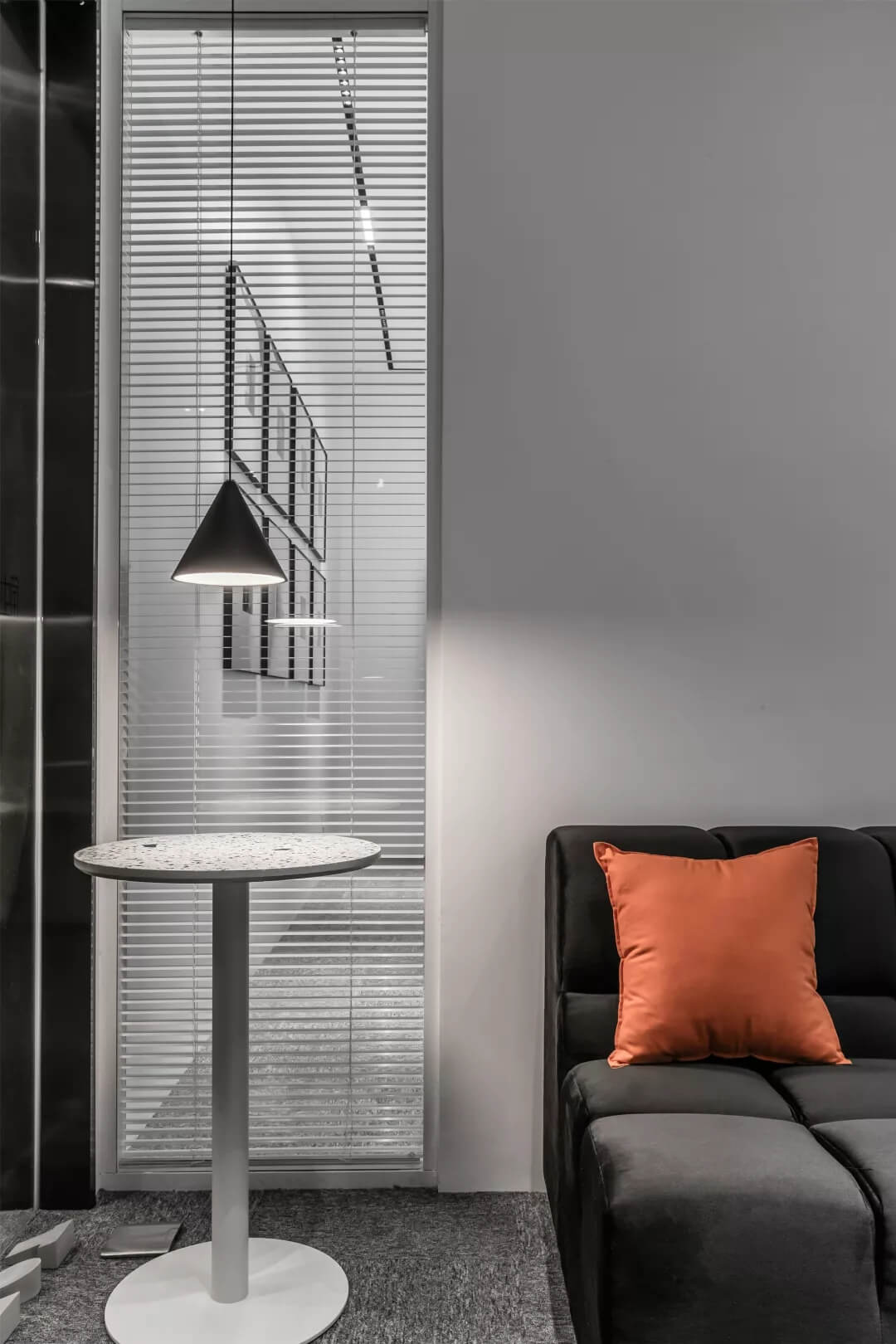 為了同時(shí)保證隱私和透明,張馳有道。會(huì)議室采用了玻璃+百葉窗的設(shè)計(jì),這樣的交流區(qū)域保持彼此的通透與聯(lián)接,提升了場(chǎng)所的張力。使用貼合設(shè)計(jì)的局部掛畫藝術(shù),配以金屬的深邃感官,多媒體影視裝置加強(qiáng)了墻面空間的信息輻射作用。