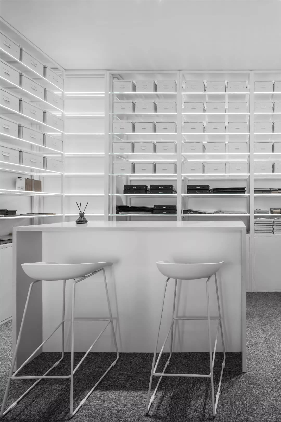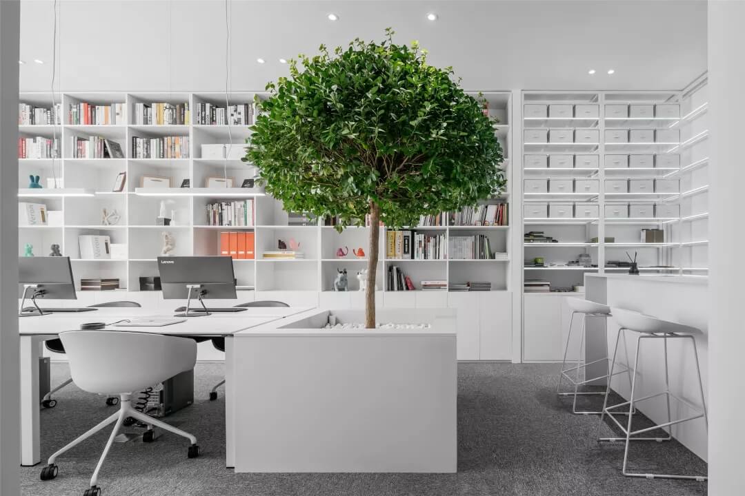 在這里,未知的一切與既有的常識(shí)記憶產(chǎn)生傳導(dǎo),想象思維的觸角開始蔓延。小株綠樹分隔出挑高的白色高座式二人桌,提供了一種更為隨性、更利于面對(duì)面交流的辦公形式。