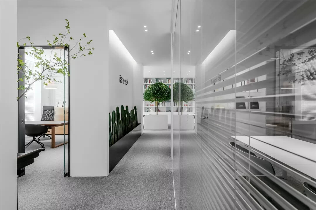 觸覺(jué)設(shè)計(jì)巧妙擷取文化于當(dāng)代都會(huì)空間,展現(xiàn)出雅致韻味的同時(shí)留下了更多觸碰的余地。綠植來(lái)點(diǎn)亮辦公場(chǎng)所的鮮活生命力,清逸的色彩是思想游龍的軌跡,在留白的空間中伸出觸角,觸覺(jué)所及之處,思維綻放遐想。