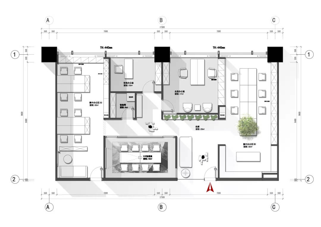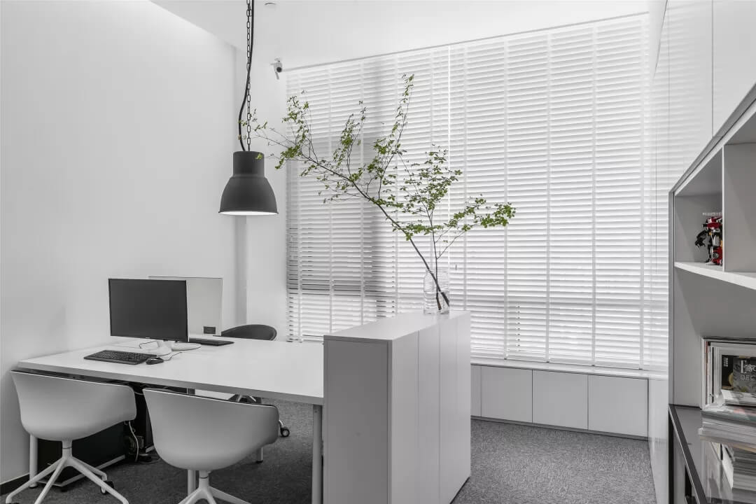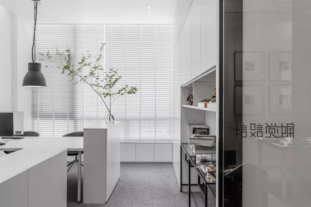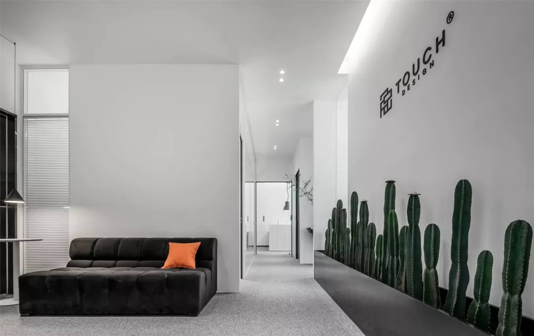 刪繁就簡(jiǎn),以最經(jīng)典的白色為主題搭配色調(diào),沒(méi)有繁瑣的辦公室設(shè)計(jì)和過(guò)多的裝飾,減去辦公中的壓抑感。通過(guò)將自然純凈的白色與沉靜黑色相結(jié)合,將品牌形象簡(jiǎn)潔地呈現(xiàn)表達(dá),同時(shí)為左右空間的過(guò)渡創(chuàng)建和諧觀感。純白的墻面,接近心靈的澄凈;仙人掌是視覺(jué)的焦點(diǎn),恣意生長(zhǎng)、堅(jiān)韌、夯實(shí)根基,也正寓意著公司的設(shè)計(jì)理念:有所依、有所仗、有所長(zhǎng)。