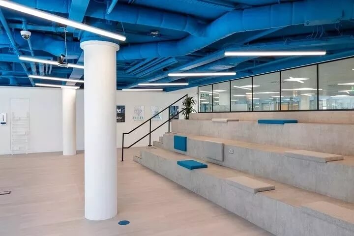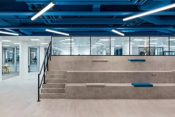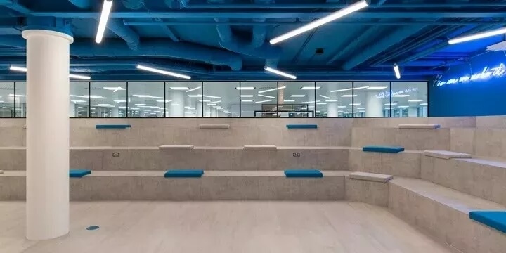 特點(diǎn):科技,總部、英國(guó)、斯堪的納維亞設(shè)計(jì)風(fēng)、寧?kù)o自然簡(jiǎn)約、灰色、藍(lán)色頂面、水泥質(zhì)感、看臺(tái)式階梯座、車廂座、玻璃隔斷