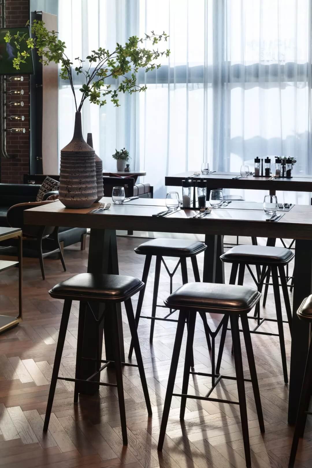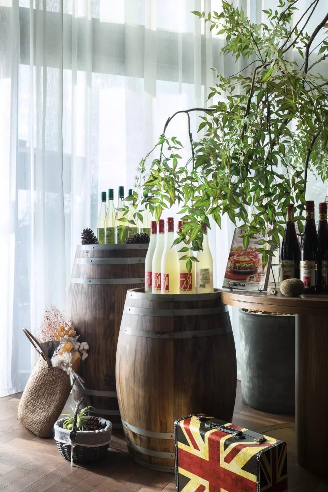 自然的青翠綠意與質(zhì)樸的啤酒桶木藝氣質(zhì)互融,靈韻交加,酒香沁人,不加過(guò)多修飾地圍合出一隅相對(duì)靜謐的臨窗休閑區(qū)。在這里,設(shè)計(jì)透過(guò)落地玻璃窗的相隔將內(nèi)外視域完全打開,陽(yáng)光傾灑進(jìn)來(lái),引入截然不同的清新與濃密的自然舒適度,外在景觀與內(nèi)在布設(shè)氣質(zhì)相合。