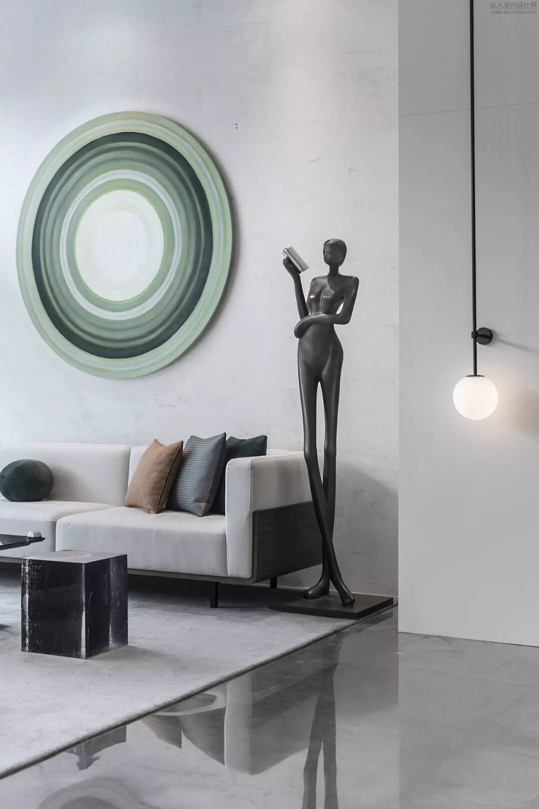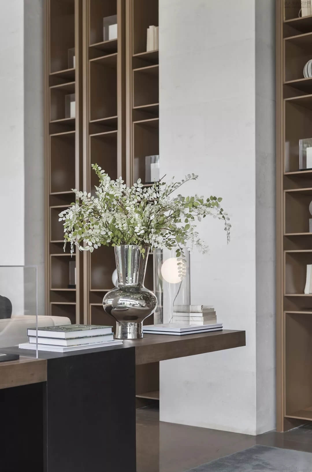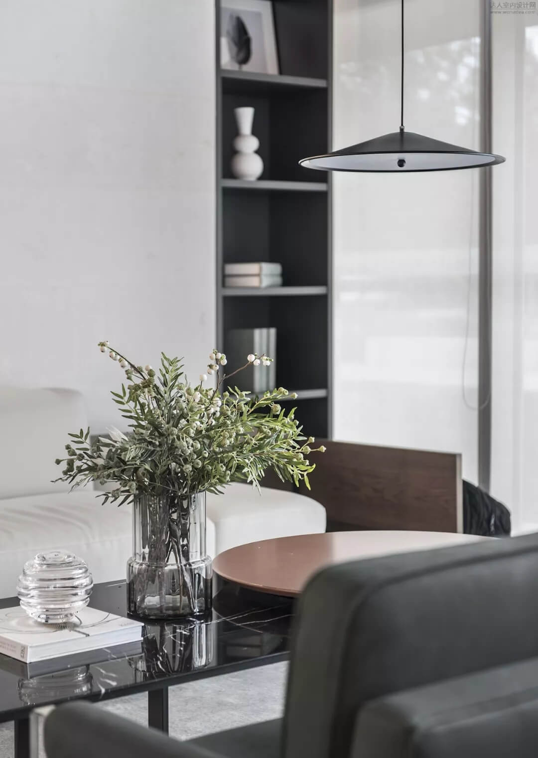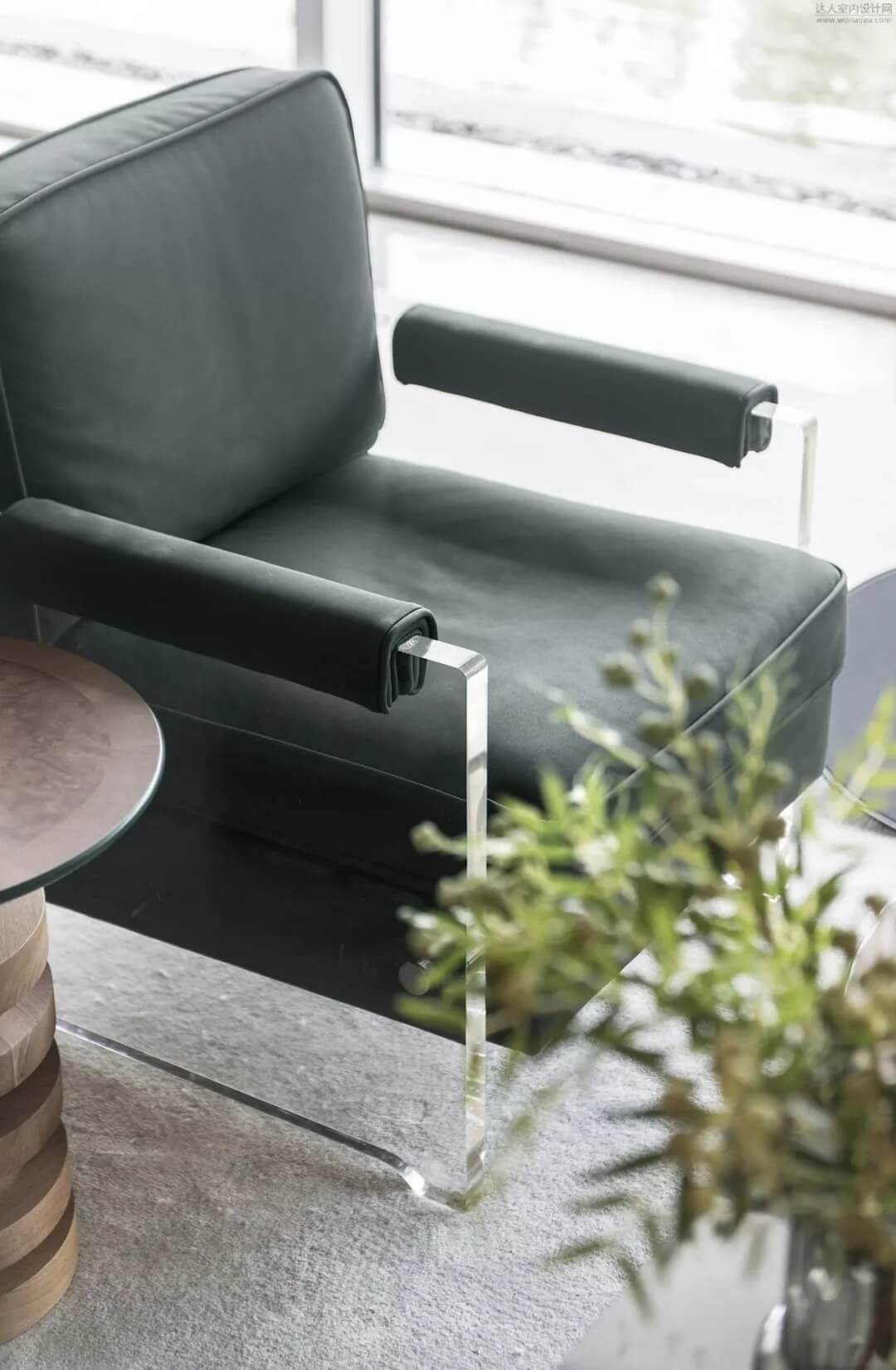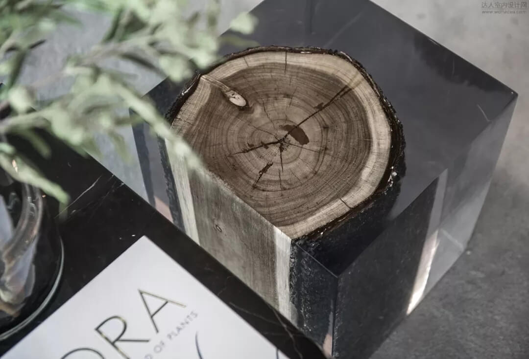 尊重木質(zhì)的肌理美感,熟諳工藝,亞克力材質(zhì)包裹的木質(zhì)年輪,如同凍結(jié)了時(shí)間的流逝,守住這一刻的永恒。簡(jiǎn)潔的質(zhì)感綠色皮質(zhì)沙發(fā)予以低調(diào)的奢華,同色系的植被增加了空間層次感。