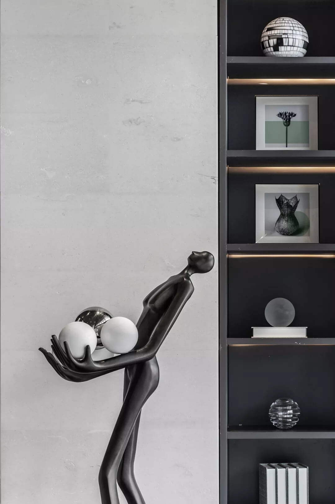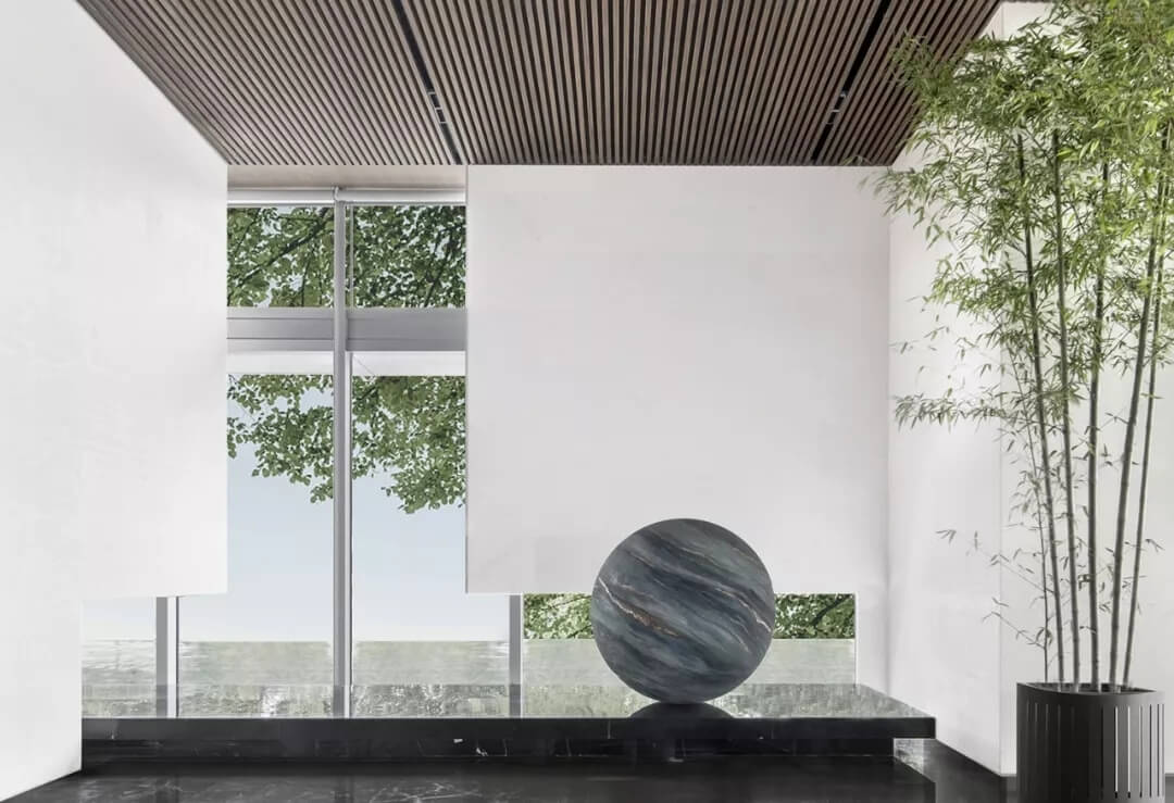 進(jìn)入前廳,暗涌波動(dòng)的猶如海洋的紋理型球狀醒目與空間,設(shè)計(jì)師賦予的撞色又猶如浩瀚星空。以玻璃與室外的相隔,營造視覺的感覺錯(cuò)覺,仿若一體的空間綿延。