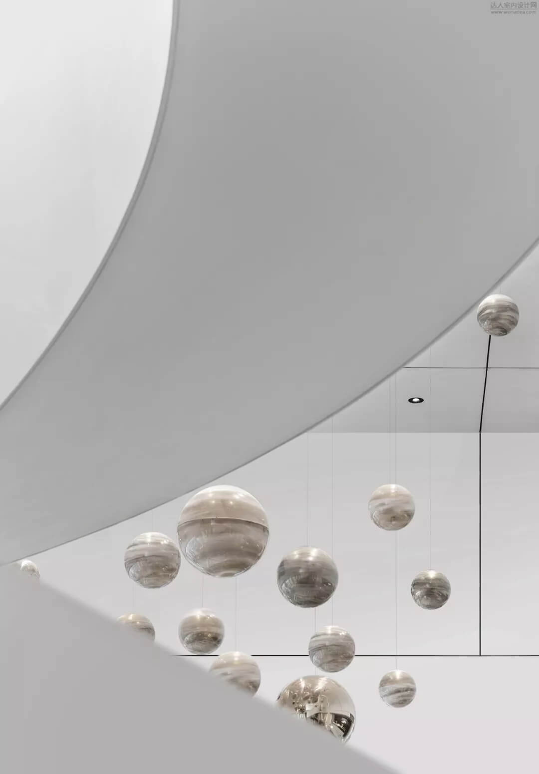 以和諧地球?yàn)槔砟钫归_的設(shè)計(jì)元素,售樓處上方錯(cuò)落有致、大小不同的球體精致的點(diǎn)綴著空間,紋理折射光線,以靜止?fàn)顟B(tài)演繹動(dòng)態(tài)。