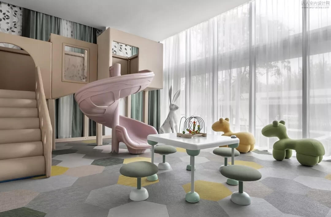 兒童區(qū)曼妙著森林深處的味道,暖暖的顏色彩散發(fā)著與自然 ,生命,和平共處的氣息,玻璃的陽光開放式結(jié)構(gòu),智慧的精靈無處不在,響應(yīng)著空間的靈動(dòng)氣息。
