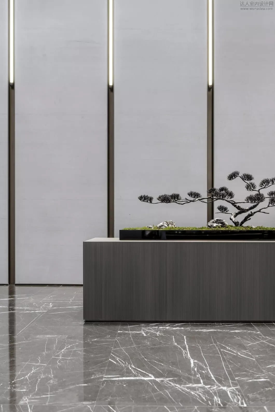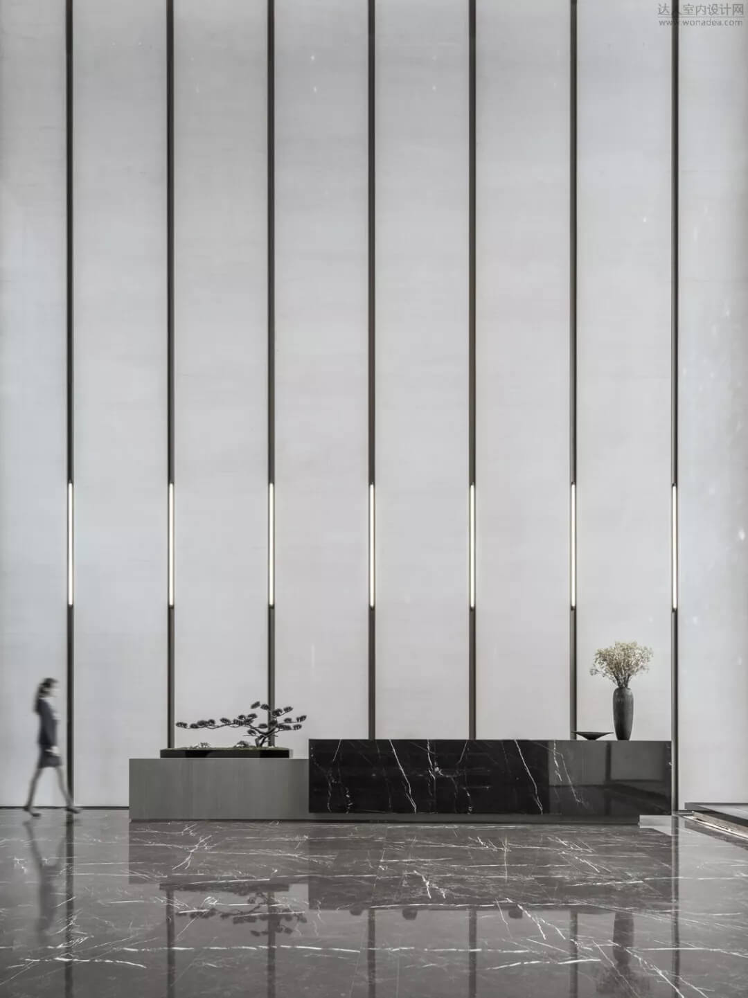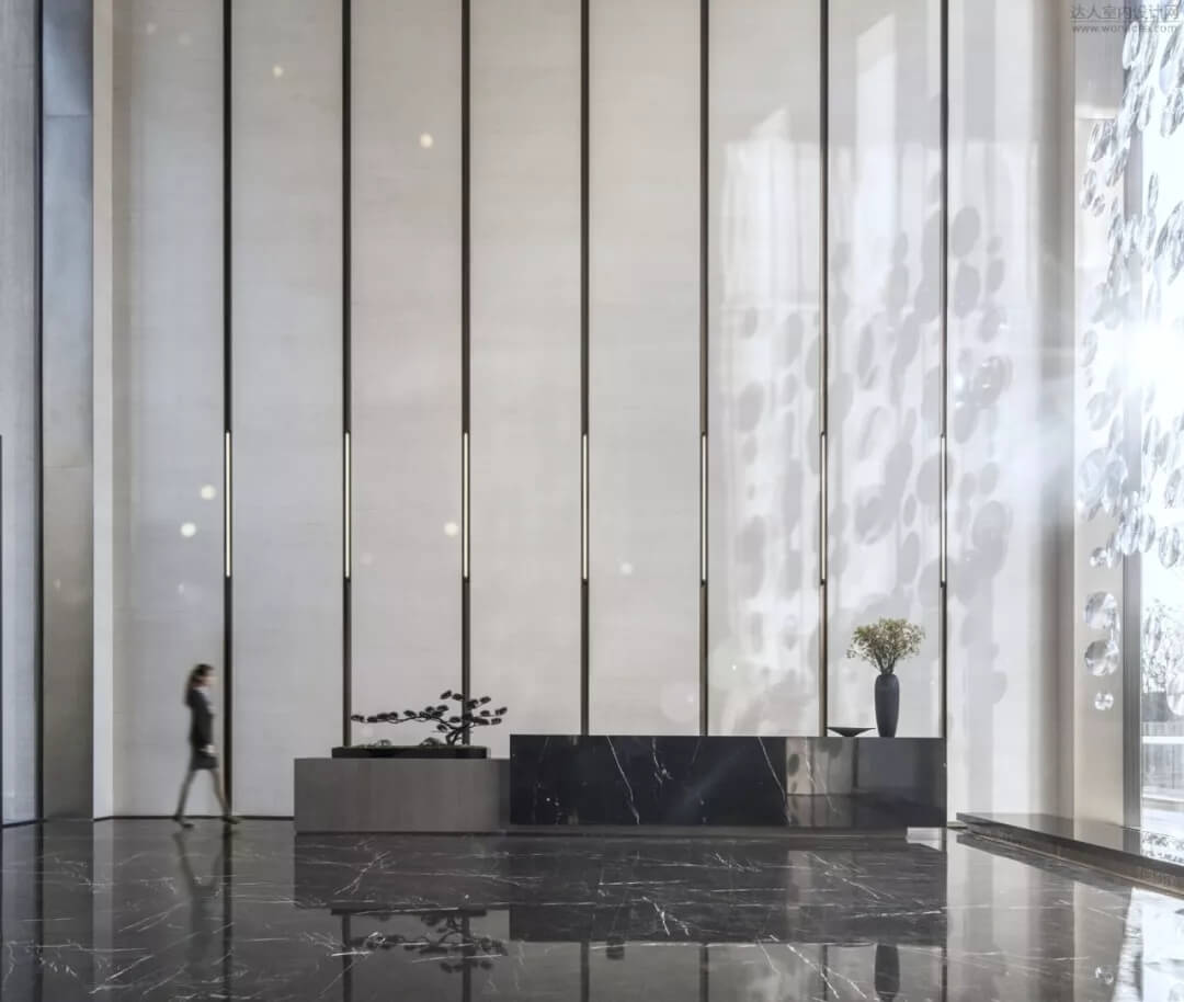 通過豐富的景觀區(qū)進入門廳,感受到空間的空靈,立面設計過濾了來自于外界的繁復。十米挑空的大廳,墻面以米色砂巖為基底,黃銅色金屬強化縱向的比例,凸顯出空間的氣勢。入口對景設置的水景讓穿梭其中的訪客仿若能傾聽到潺潺水聲,同時水景和懸掛的軟裝裝置相得益彰,充滿巧妙的用意,同時也分隔了挑高通透的玻璃幕墻,虛實結合,體現(xiàn)現(xiàn)代設計的東方神韻。
