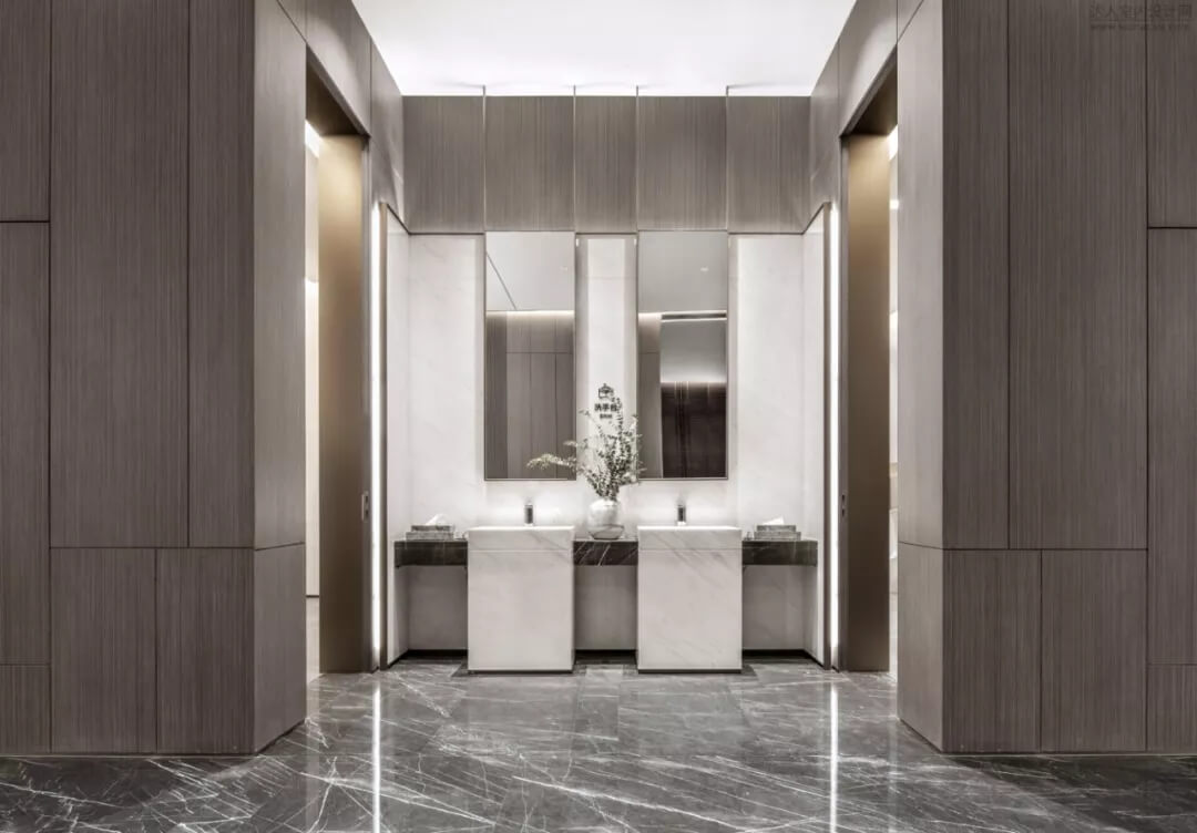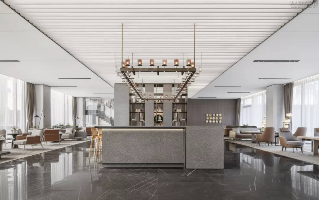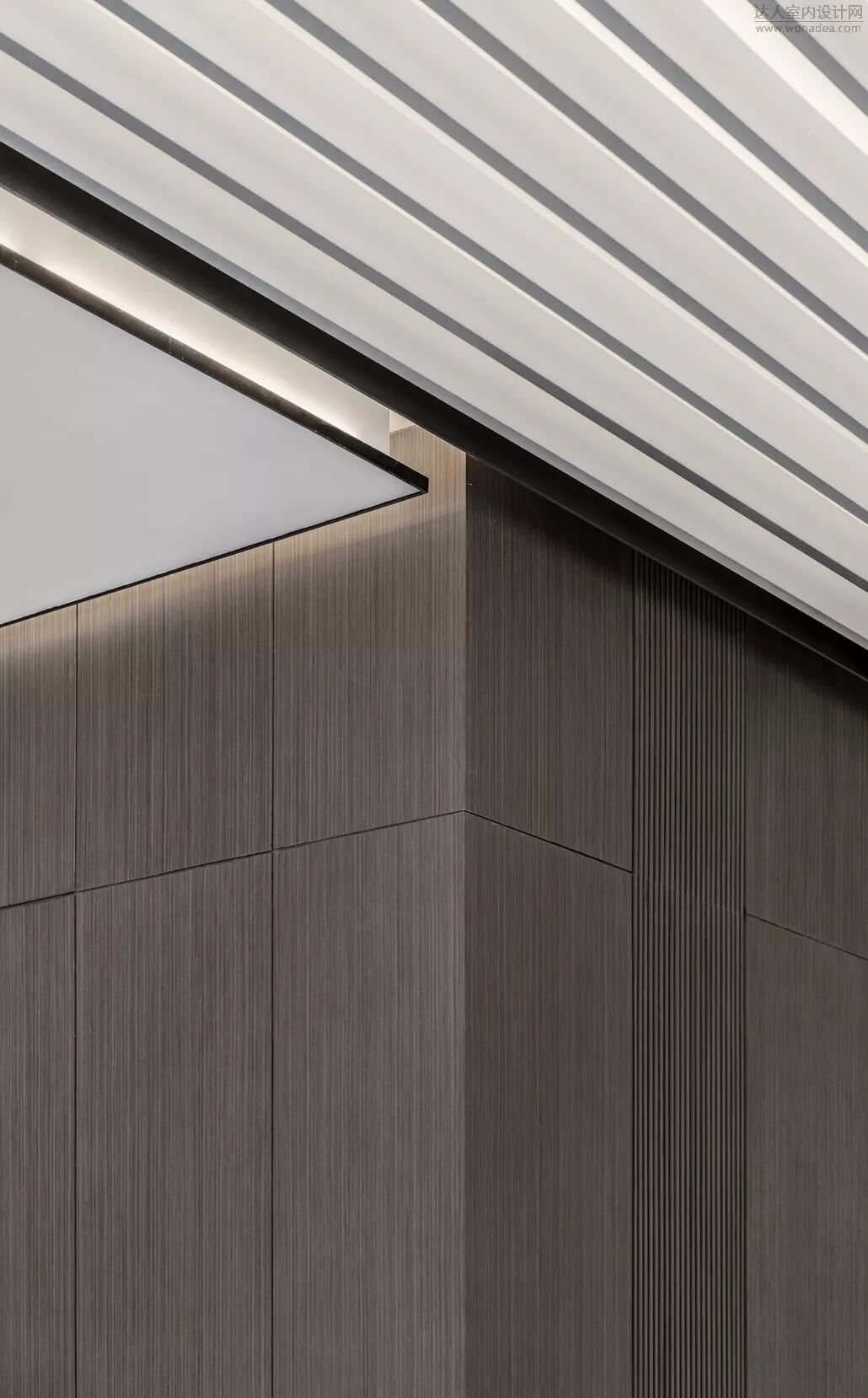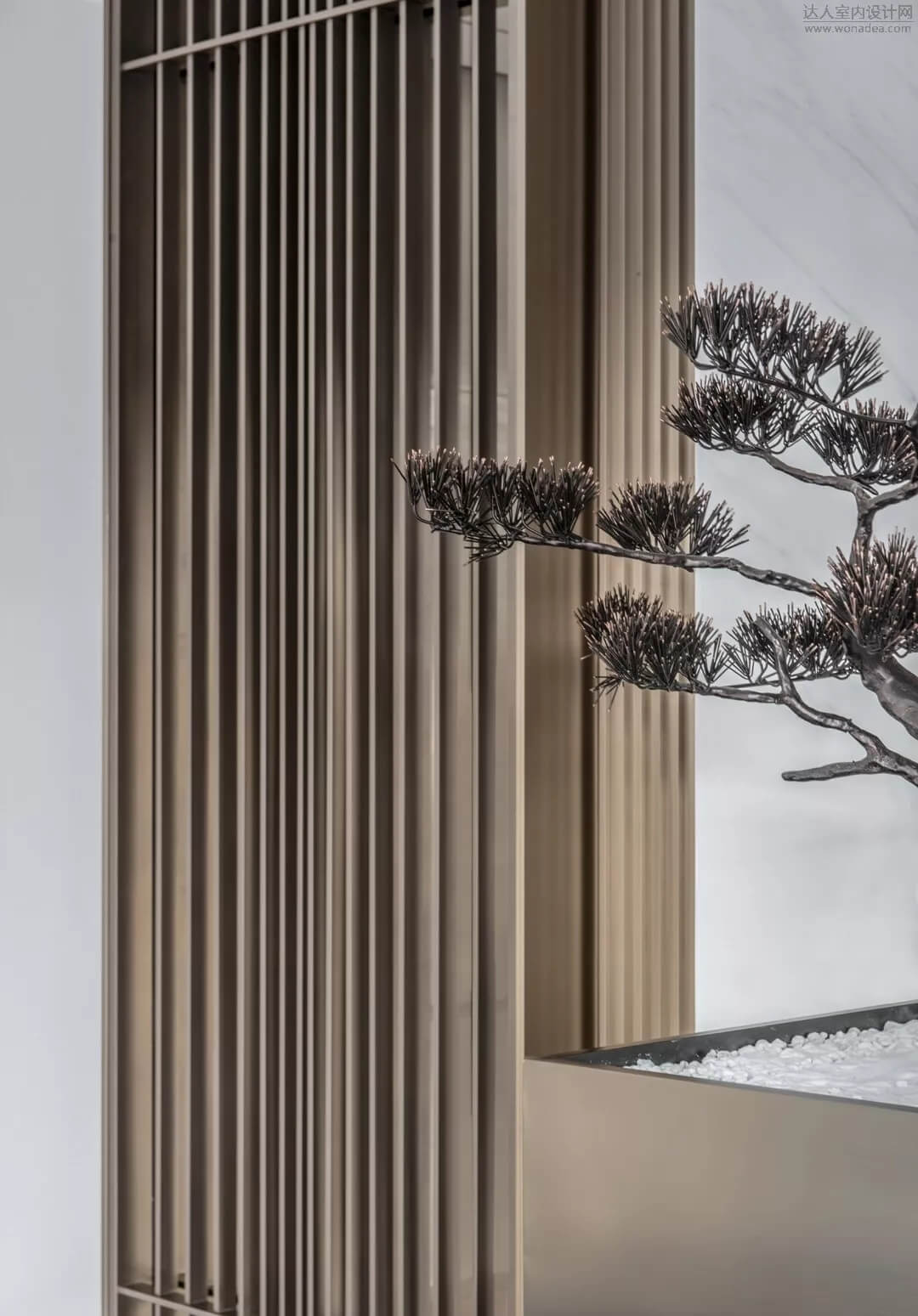 通過豐富的景觀區(qū)進入門廳,感受到空間的空靈,立面設計過濾了來自于外界的繁復。十米挑空的大廳,墻面以米色砂巖為基底,黃銅色金屬強化縱向的比例,凸顯出空間的氣勢。入口對景設置的水景讓穿梭其中的訪客仿若能傾聽到潺潺水聲,同時水景和懸掛的軟裝裝置相得益彰,充滿巧妙的用意,同時也分隔了挑高通透的玻璃幕墻,虛實結合,體現(xiàn)現(xiàn)代設計的東方神韻。