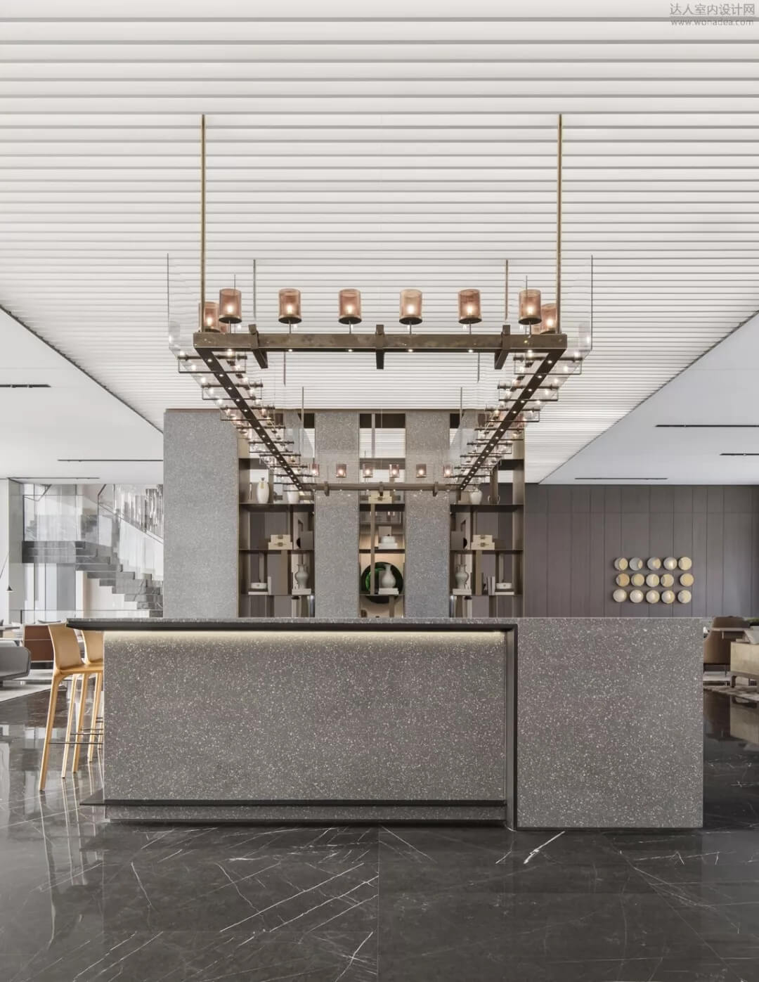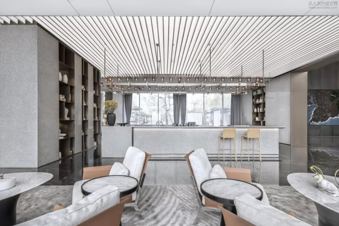 進入洽談區(qū)大廳,通過大面積全明落地玻璃窗,最大程度地將室外的建筑、景觀效果納入室內(nèi)視野,以觀景式空間概念記錄時移景易的歲月縮影。圍合形的水磨石吧臺猶如藝術裝置,成為空間的中心焦點。