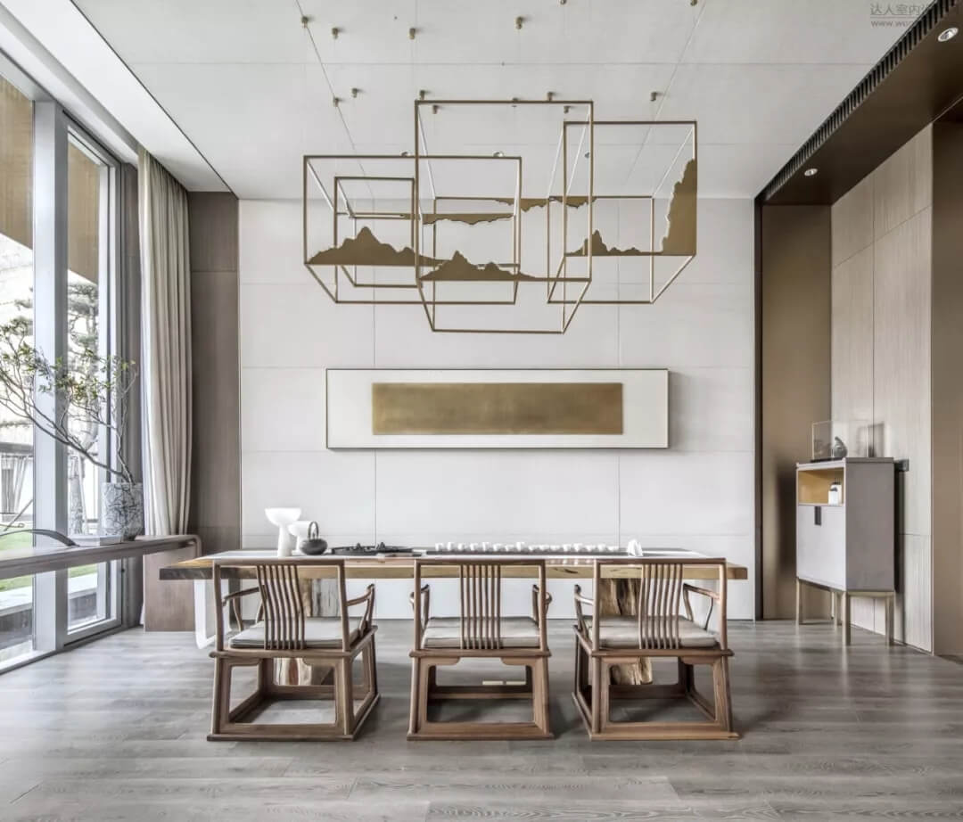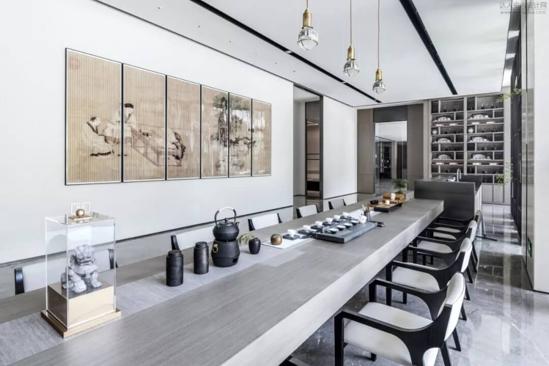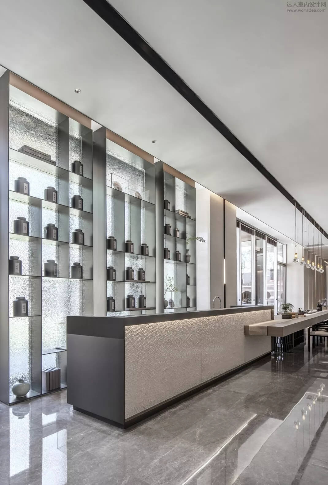 在會所品茶水吧臺區(qū)結合枯山水造景,色彩雅致內(nèi)斂,充分展現(xiàn)了中國人素來喜愛的‘靜’,同時超長條的品茶臺,利用下沉庭院的景觀和室內(nèi)產(chǎn)生了互動,模糊了室內(nèi)外的界限。藝術儀式感的空間給人帶來思考的余地。
