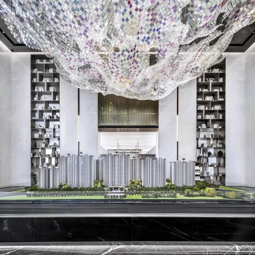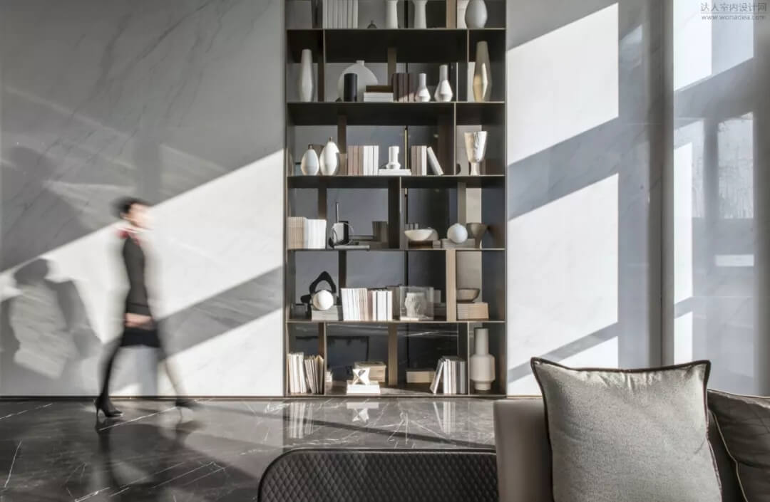 沙盤區(qū)墻面以大花白陶瓷板為主墻面,通過通高的黃銅書架體塊和金屬格柵,本身空間具有很強的中軸對稱的儀式感,凸顯出空間的大氣。曼妙的波浪曲線,以流動的韻律打破空間靜態(tài),同時從明亮空靈的大堂走入半圍合的沙盤區(qū),總能給人帶來新奇感,亦是詩意與藝術的格調(diào)升華。