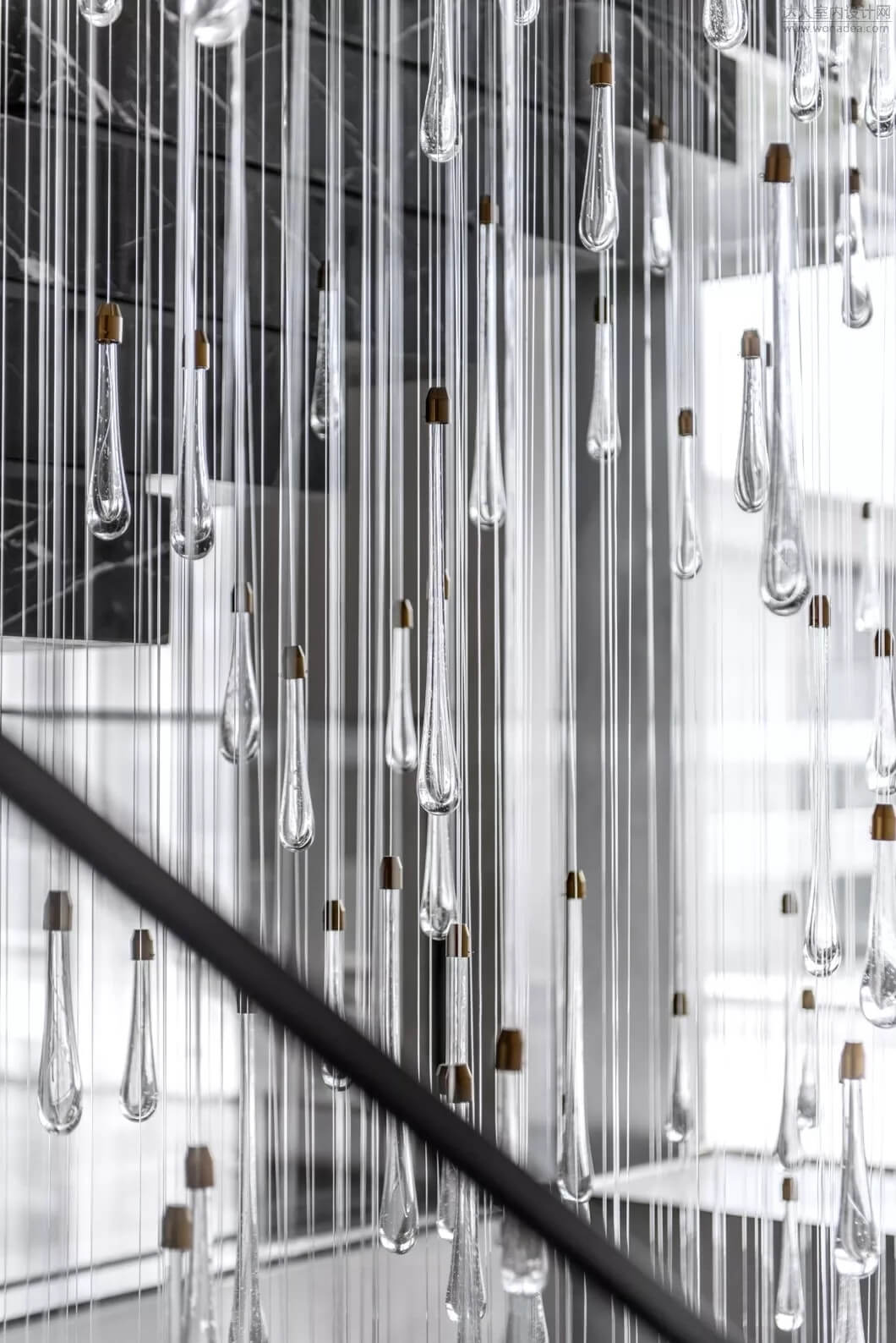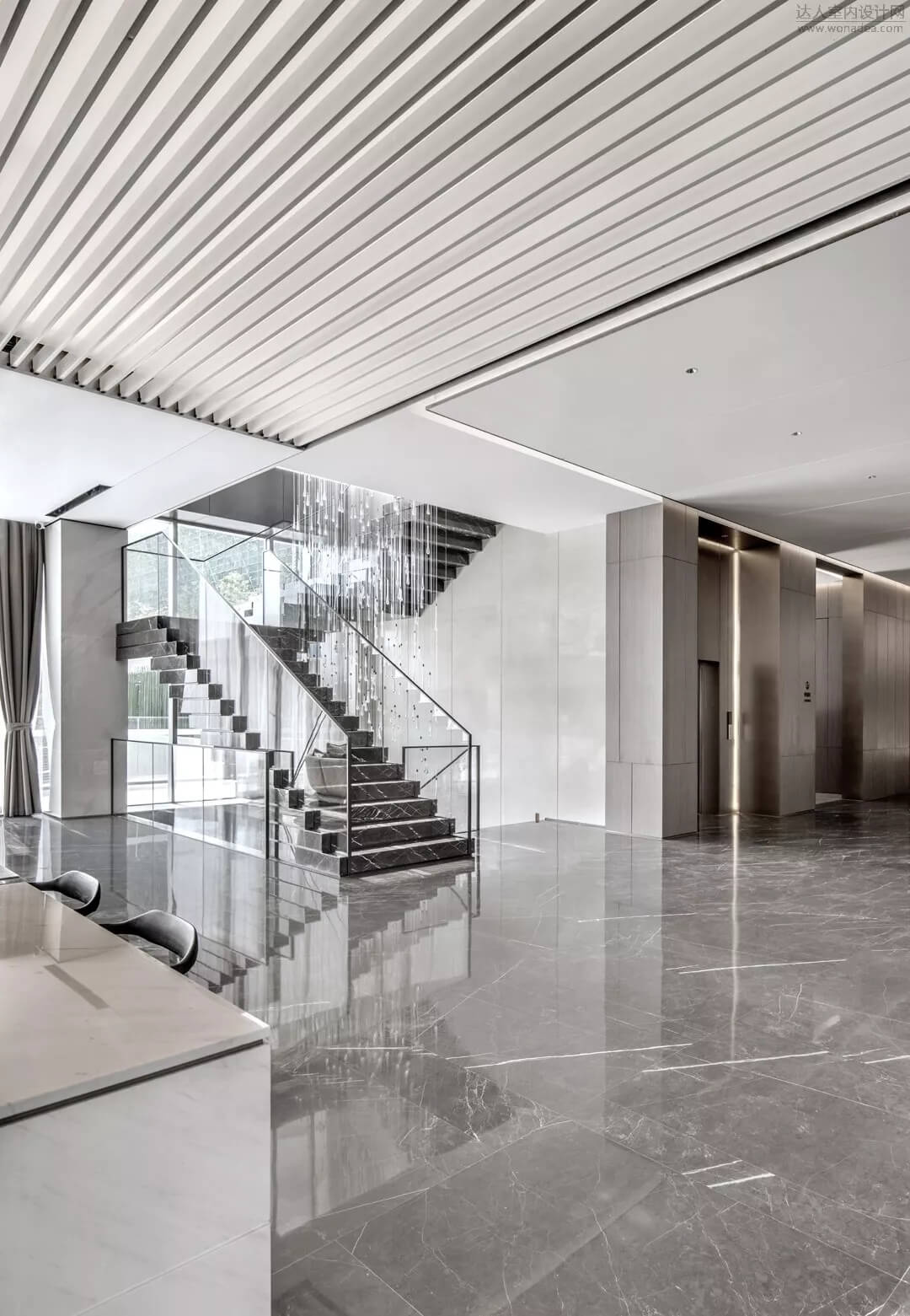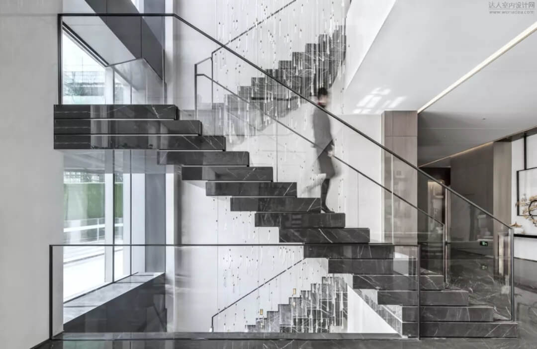 樓梯在空間中不僅是能上下的建筑物,將它打破序列重新解構,輕盈且厚重,構成如雕塑般的能量,讓它成為連接售樓處和會所的藝術裝置。樓梯的鮮明特質在精心設計下顯得非常令人矚目,結合樓梯下面的水景,讓空間賦有東方意境。