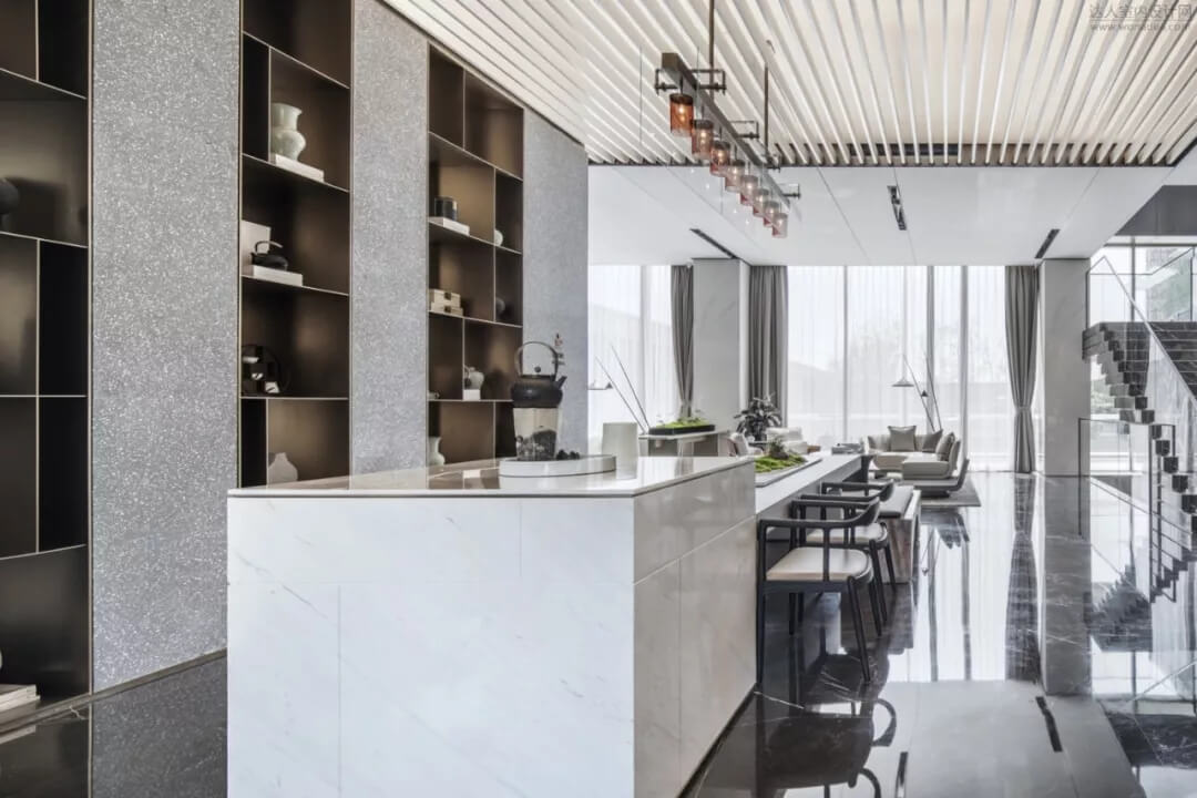 兩個吧臺相互穿插,水磨石和黃銅的材質凸顯時尚感和品質感,黃銅和水磨石是絕配,除了使用細銅條作為不同顏色的分割線,還可以用銅條增加藝術氣息,水磨石的可塑性在這種風格中最為凸顯。天花條形背光燈帶設計,現(xiàn)代空間豐富柔而輕盈。洽談區(qū)擺陳暖色為主,結合豐富的飾品擺放,使空間整體散發(fā)素凈淡雅的氣息,營造一個對談、暖意漸生的生活場景,只需稍稍駐足,便能細品一首生活靜謐詩。
