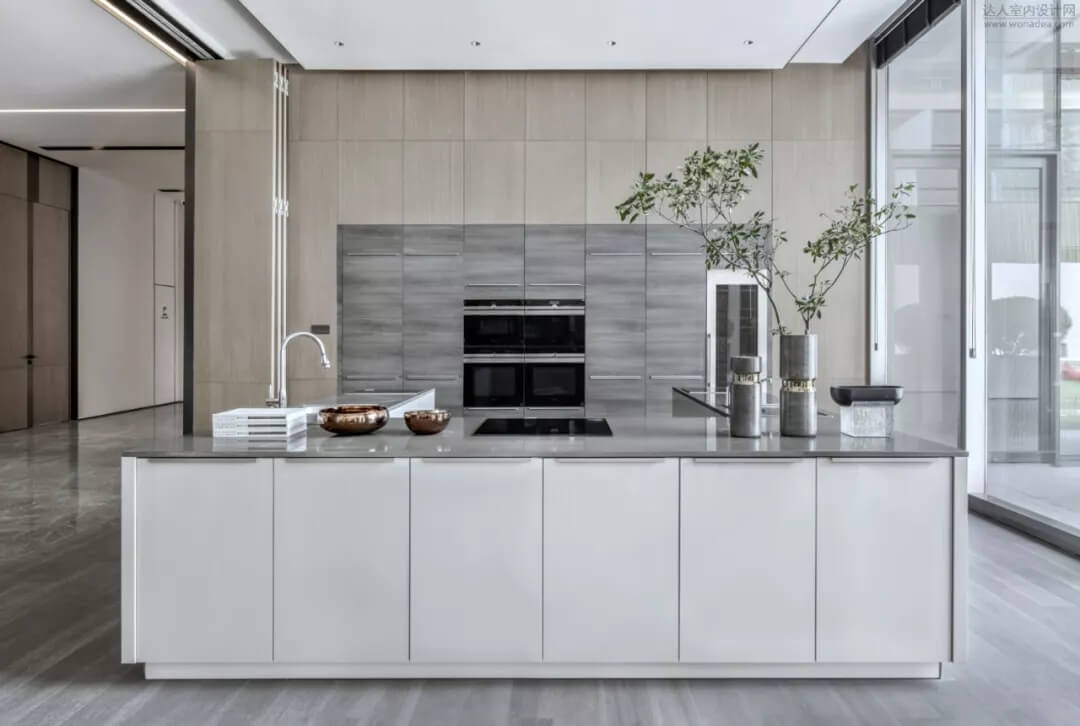 私宴,是以當代設計來描繪文人飲酒時追求的清雅意境,寄情於山水??臻g通過折疊門和西廚吧臺區(qū)產(chǎn)生互動,空間功能既獨立又有相互滲透。延續(xù)簡潔流暢的線條,布置與空間密切配合。