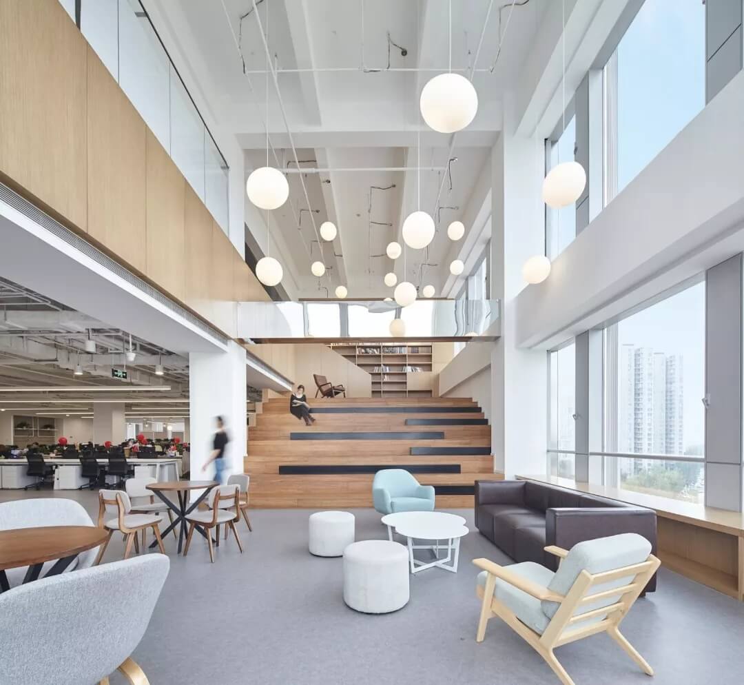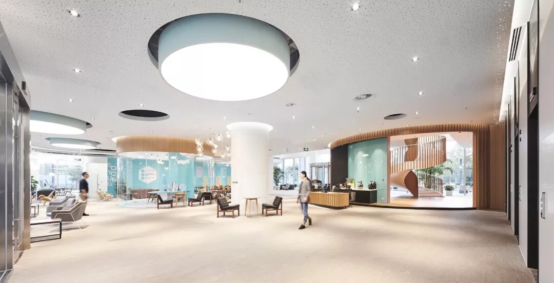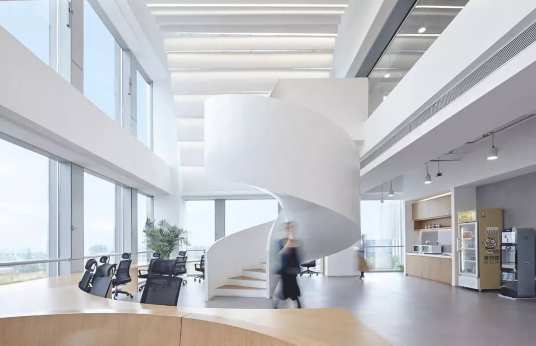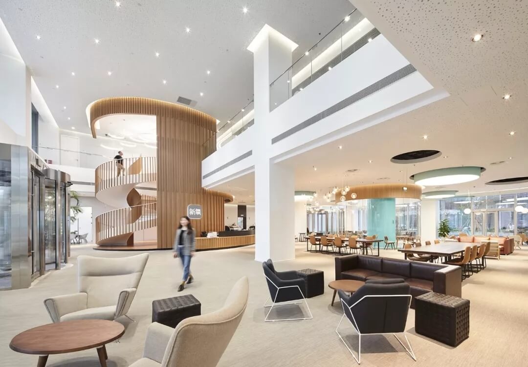 都市客廳島,選擇流暢線條的螺旋樓梯貫穿上下,運用條形面板錯縫排列成弧形的照明方式,使整個空間照度均勻,且條形面板亦可作為裝飾展示面。家居軟裝選用極簡風(fēng)格,流線組擺方式,營造自由靈活的空間,促進員工間的交流和溝通。