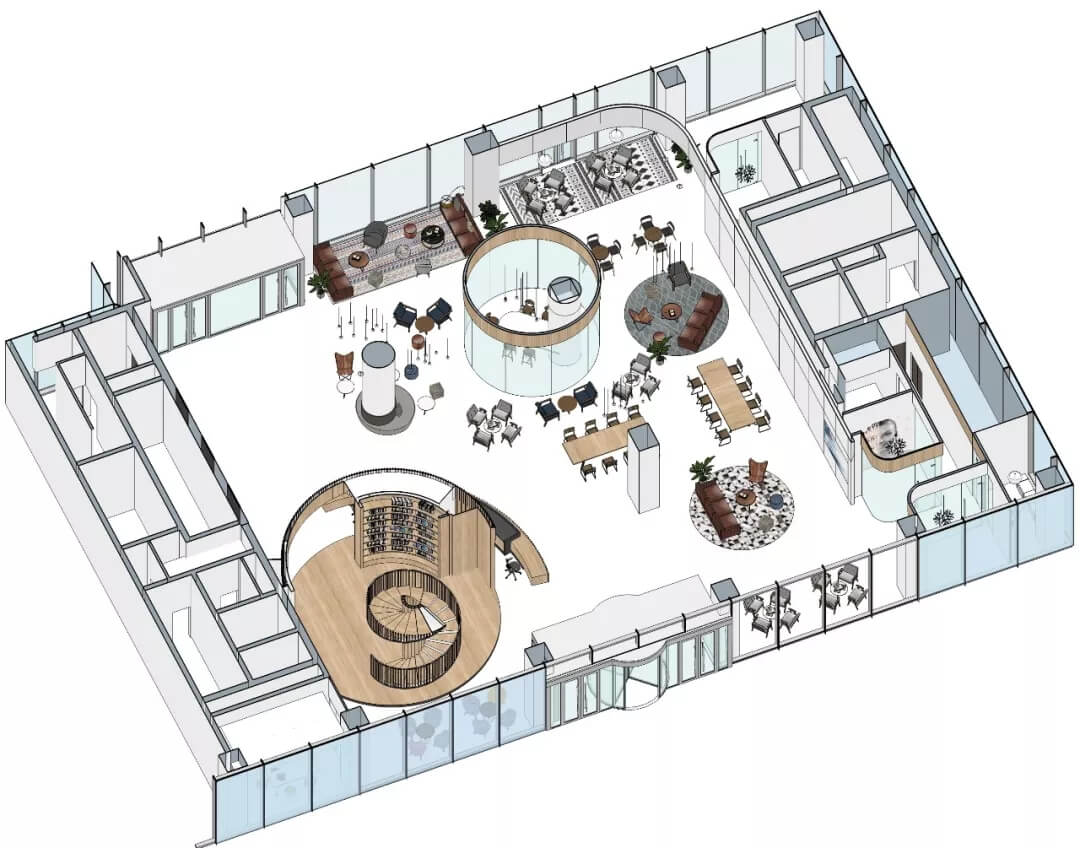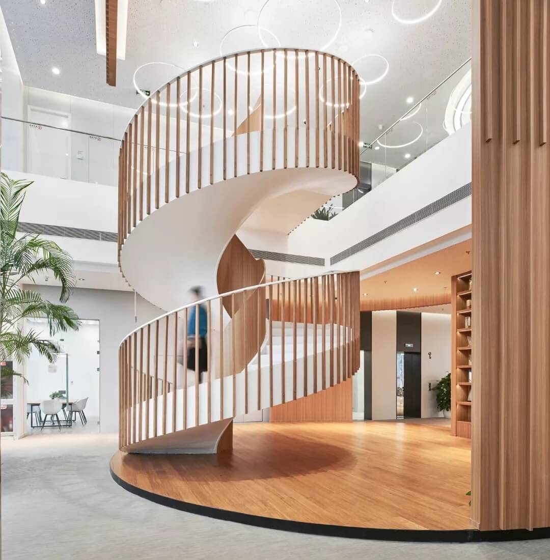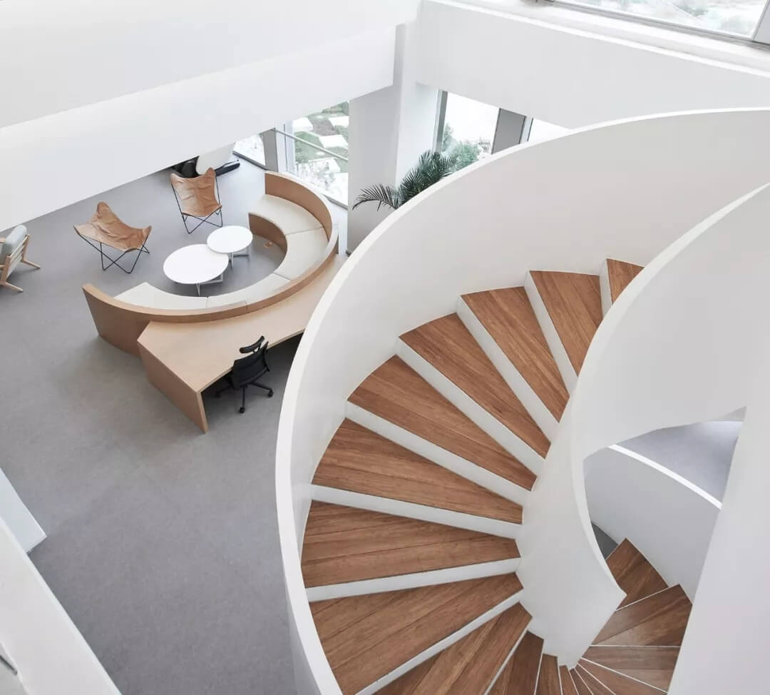 都市客廳島,選擇流暢線條的螺旋樓梯貫穿上下,運用條形面板錯縫排列成弧形的照明方式,使整個空間照度均勻,且條形面板亦可作為裝飾展示面。家居軟裝選用極簡風(fēng)格,流線組擺方式,營造自由靈活的空間,促進員工間的交流和溝通。
