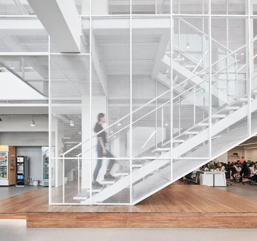 云端漫步主題島樓層公共空間設(shè)置了木質(zhì)的懸掛BOX,用白色的鋼網(wǎng)樓梯連接,樸素和輕盈通透形成鮮明的對比,如云端漫步,自然中蘊含天馬行空,打開員工的創(chuàng)意想象。