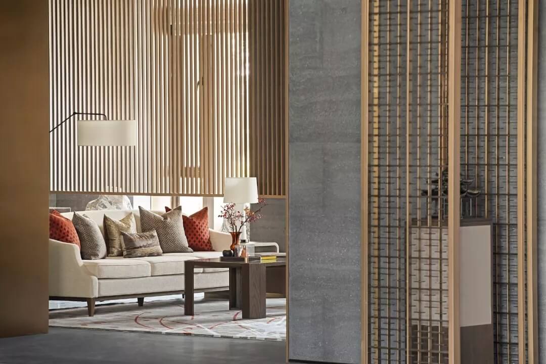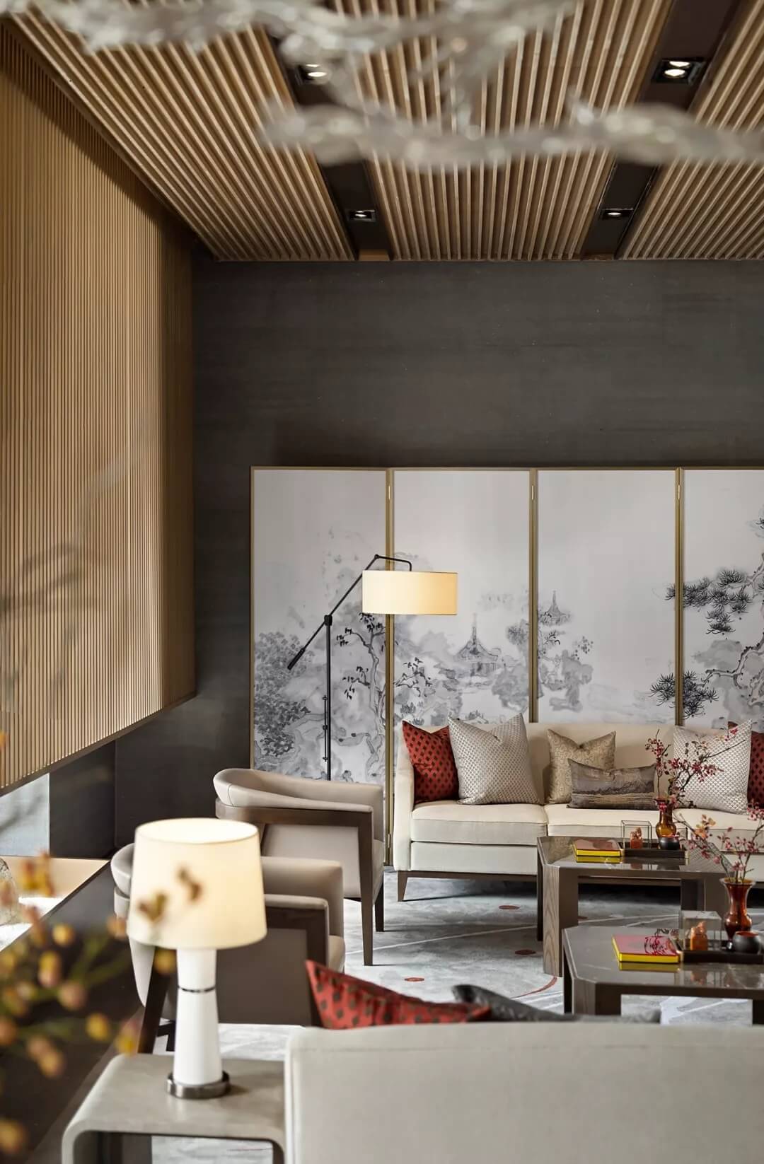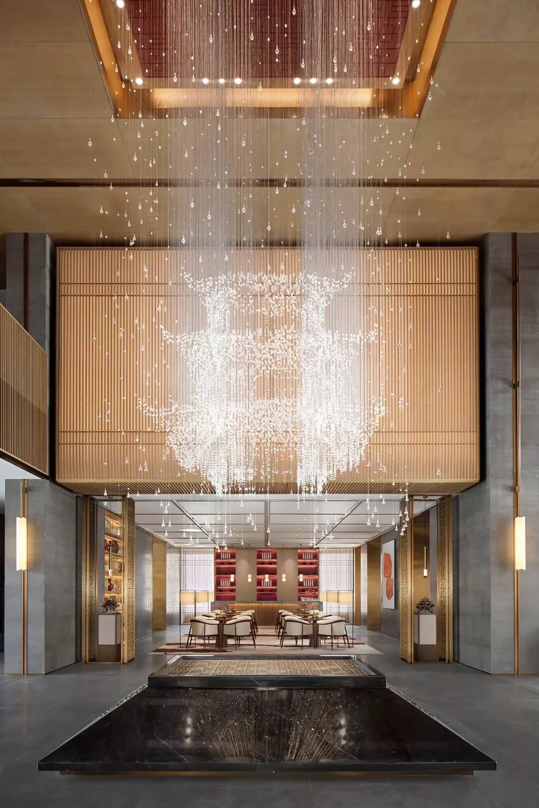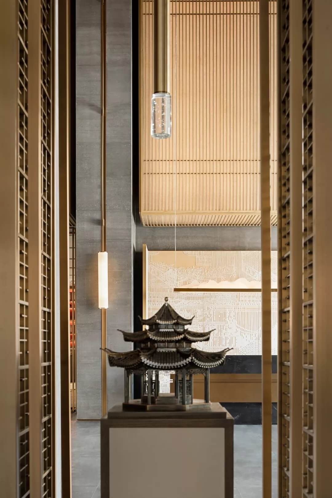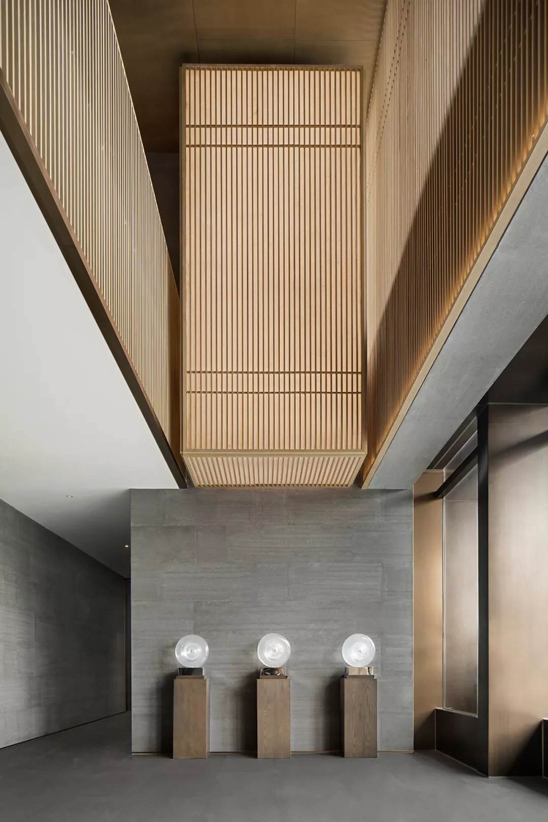 踏入第一重空間的迎賓前廳,大堂挑空高7.7米,氣勢恢宏。“甲第者以禮為官也,不學禮,無以立。”為此,迎賓區(qū)的設計干練簡潔,以飽含的禮儀序列拉開整個空間的序幕。
