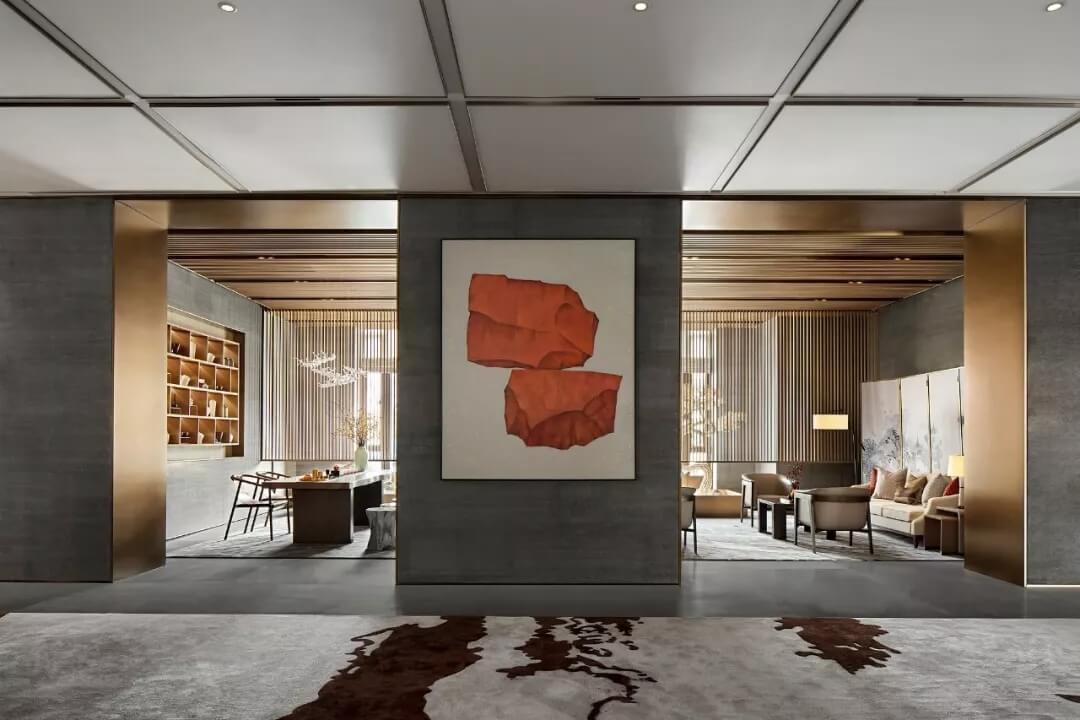 售樓處的室內設計延續(xù)其建筑風格,以簡潔精煉的手法構筑大塊面空間輪廓。室內以傳統(tǒng)官宅形制精髓為基礎,沿襲層層遞進的節(jié)奏,結合高級灰、中國紅、金屬色的主基調,用自由流暢的現(xiàn)代方式呈現(xiàn)極具雅致韻味的場景氛圍,將厚重的武漢甲第官宅文化因地制宜地展現(xiàn)在眾人面前。