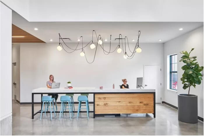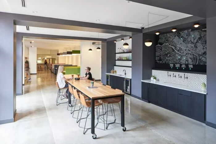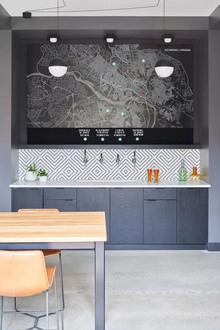 曾經(jīng)被濫用的中庭被重新構(gòu)想成該機(jī)構(gòu)的心臟-充滿活力的會(huì)議區(qū)和一間酒吧,設(shè)有來(lái)自里士滿地區(qū)的旋轉(zhuǎn)水龍頭。大堂取代了傳統(tǒng)的bun堡般的接待臺(tái)和獨(dú)立的休息區(qū),而是變成了一個(gè)畫廊—充滿活力,動(dòng)感十足,并嵌入了里士滿的性格。還有接待處?那個(gè)也被定制的鋼制桌子代替,該桌子可以兼作員工的共同工作空間。