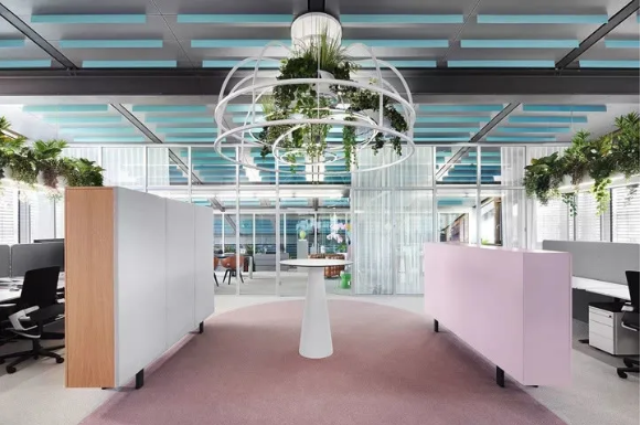 首先,設(shè)計(jì)團(tuán)隊(duì)為這處工作場(chǎng)所增添了2100個(gè)超級(jí)盆栽植物。綠植能產(chǎn)生良好的情緒、降低精神壓力、促進(jìn)創(chuàng)新、提高績(jī)效。此外,綠植還能改善空氣質(zhì)量、營(yíng)造健康環(huán)境,并起到降噪的作用。它們只需定期澆水就能保持茂盛狀態(tài),因此深得人心。室內(nèi)盆栽植物具有強(qiáng)大的正能量。自從加入了這些綠化,室內(nèi)濕度不僅從18%增加到44%,讓人們的體感非常舒適,連員工的病假都減少了一半!